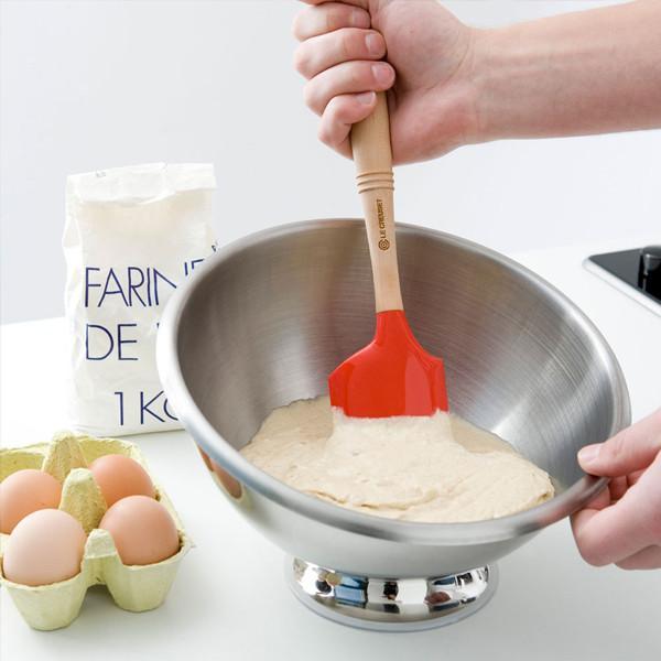 Espátula con cabezal grande de Le Creuset con mango de madera y cabezal de silicona. Es perfecta para mezclar, servir, sofreír, saltear o raspar nuestra cocotte o sartén ya que su cabezal de silicona flexible nunca dañará nuestros utensilios. El cabezal de silicona, extraíble, no absorbe olores ni sabores de alimentos.