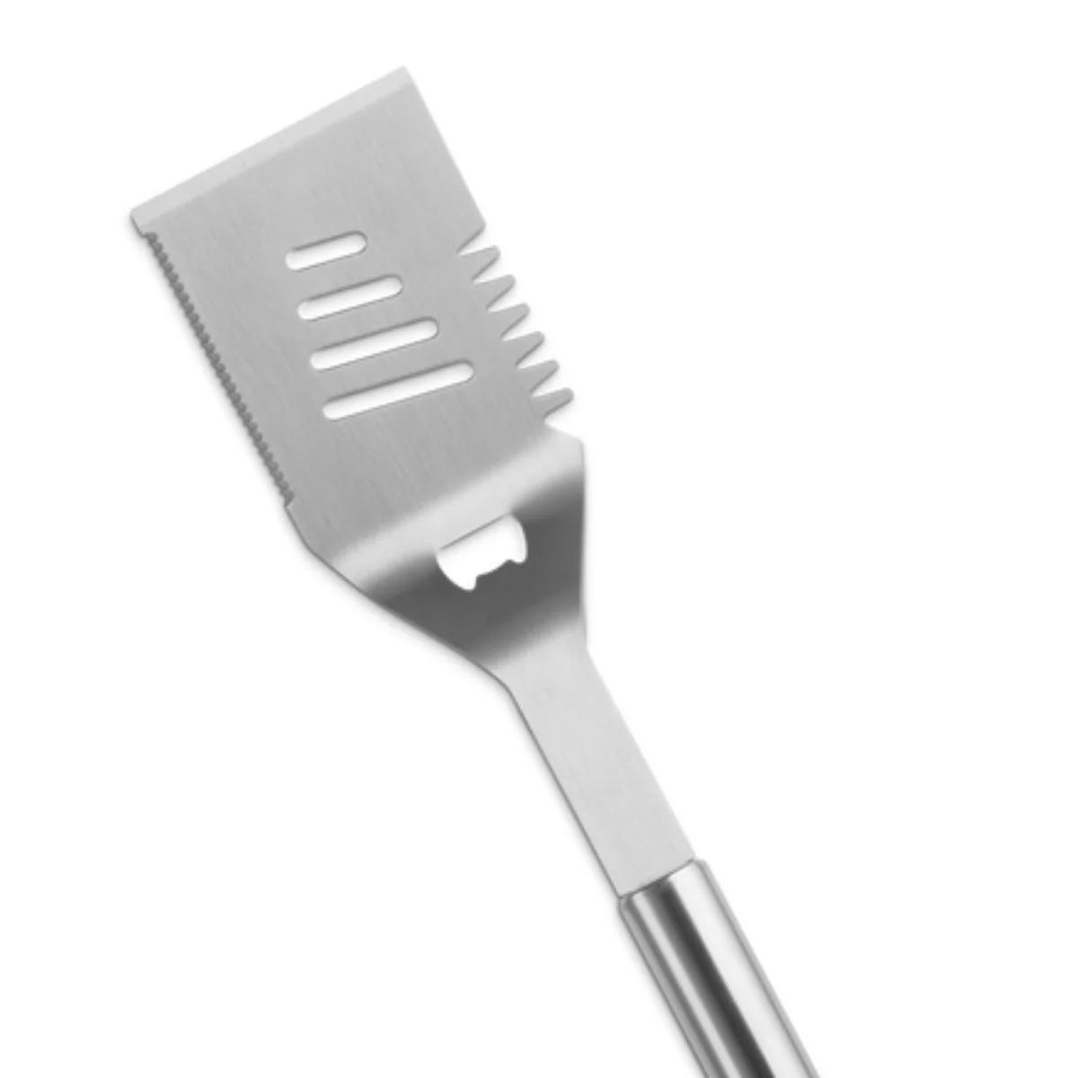 Las ranuras en el cabezal permiten que la grasa se escurra mientras volteas los alimentos, asegurando una cocción más saludable. Las crestas laterales están diseñadas para limpiar las rejillas de la parrilla con facilidad, lo que la convierte en una herramienta versátil y muy útil. Además, incorpora un práctico abridor de botellas, para que puedas disfrutar de tus bebidas frías al aire libre mientras cocinas una deliciosa parrillada en tu barbacoa.