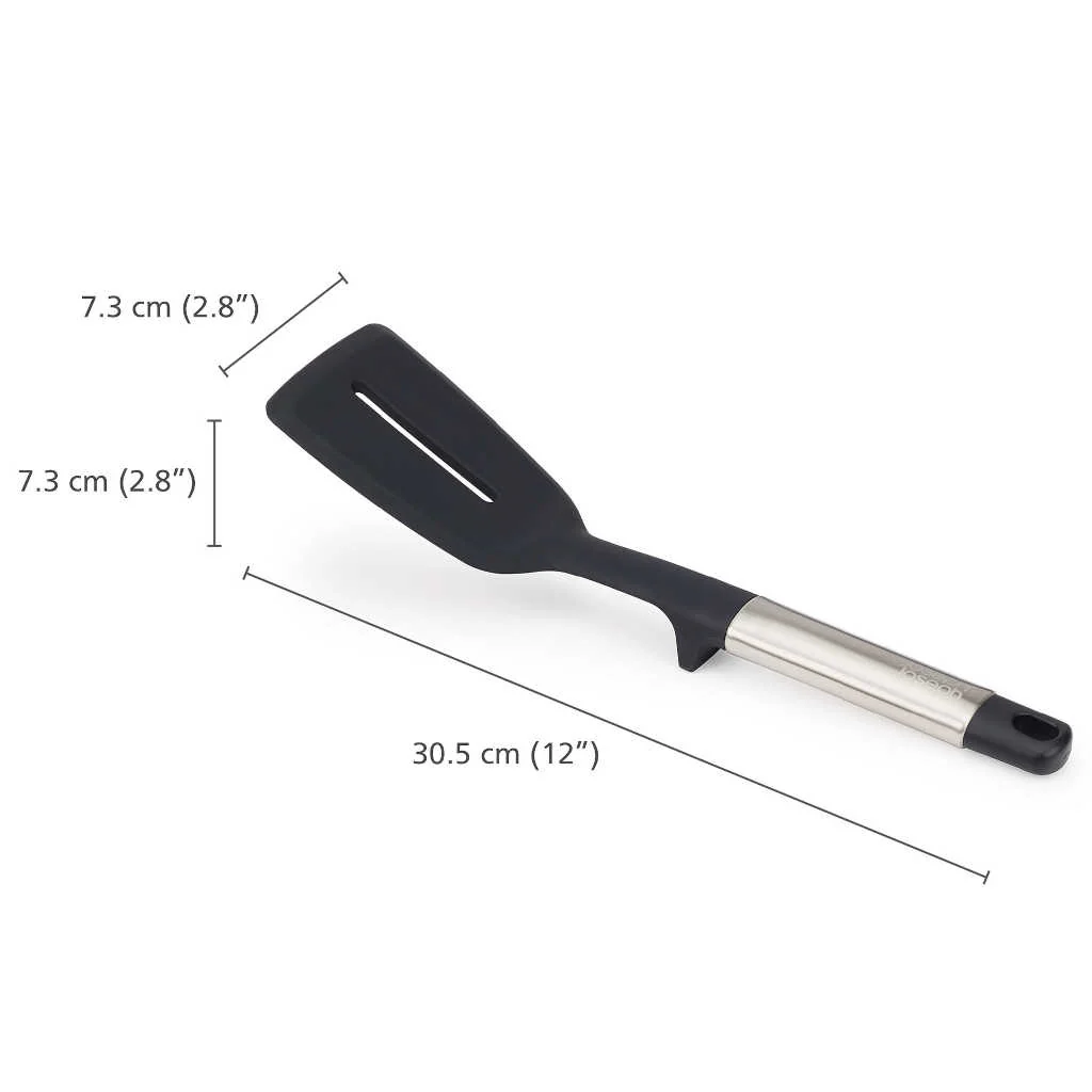 La Espátula ranurada de silicona Elevate Joseph Joseph es una pala ranurada de lo más práctica. Su amplio cabezal tiene el ancho perfecto para recoger y voltear los alimentos que estás cocinando. Su elegante mango de acero inoxidable cuenta con contrapeso y pestaña integrada, para que puedas dejar la espátula en la encimera sin que el cabezal toque la superficie. Además, al ser de silicona, es perfecta para usar con todos tus utensilios, incluso los antiadherentes, sin dañarlos.
