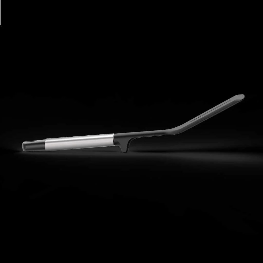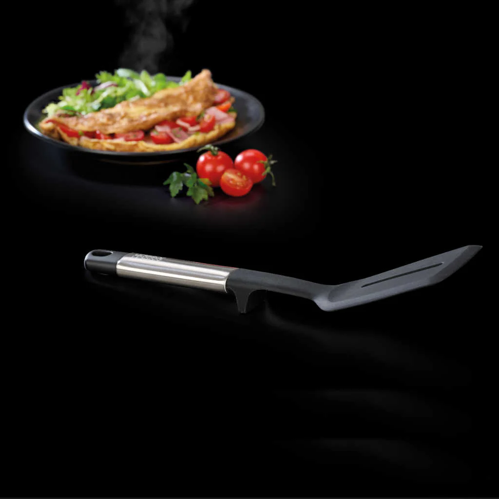 La pestaña del mango, no solo la hace más higiénica al evitar que el cabezal toque la encimera, sino que también te ayudará a tener el espacio de trabajo más ordenado mientras prepararas tus recetas. El cabezal es resistente a temperaturas de hasta 210˚C y al estar ranurada permite escurrir los líquidos y la grasa de la cocción de los alimentos. El mango cuenta con un orificio para poderla colgar, teniéndola siempre a mano y facilitando su almacenamiento.