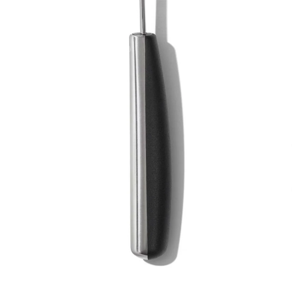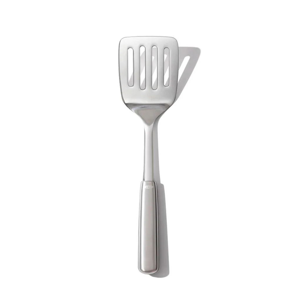 La Espátula rasera de cocina Steel™ OXO es una pala ranurada de acero inoxidable, amplia y muy funcional. Su elegante diseño es además muy práctico, gracias al ligero ángulo entre el mango y la espátula. Este ángulo permite manejarla de forma cómoda y ergonómica al voltear los alimentos o al servirlos en el plato. El mango dispone de un revestimiento de tacto suave y antideslizante, para su uso cómodo, incluso con las manos mojadas.