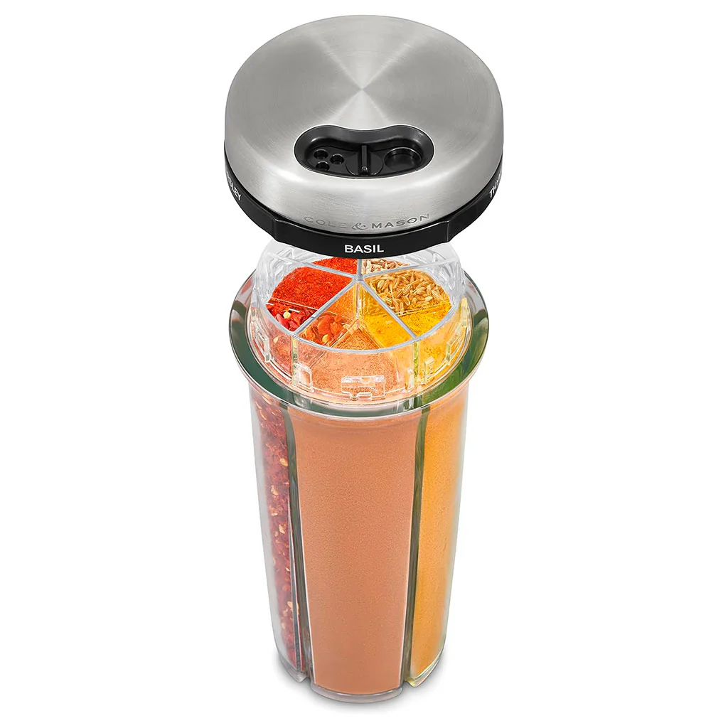 Gracias a su diseño compacto que tiene la capacidad de almacenar hasta 5 frascos de especias o hierbas aromáticas, este recipiente ocupará mucho menos espacio en tus armarios. Usarlo es muy sencillo: solo tienes que girar el cilindro para seleccionar uno de los 5 compartimentos etiquetados, y después verter o espolvorear directamente en tu receta. ¡Así de fácil!