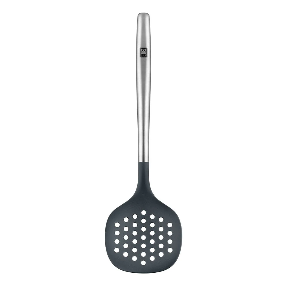 Manejar esta espumadera Signature de BRA es muy cómodo, su mango de acero inoxidable 18/10 cuenta con un diseño ergonómico que permite que sea muy agradable agarrarlo y utilizarlo. La pala, fabricada en silicona y nylon, tiene el tamaño perfecto para que puedas sacar las croquetas, los calamares o los buñuelos de la sartén de forma fácil y escurrir el aceite sobrante. ¿A qué esperas para disfrutar de ella?