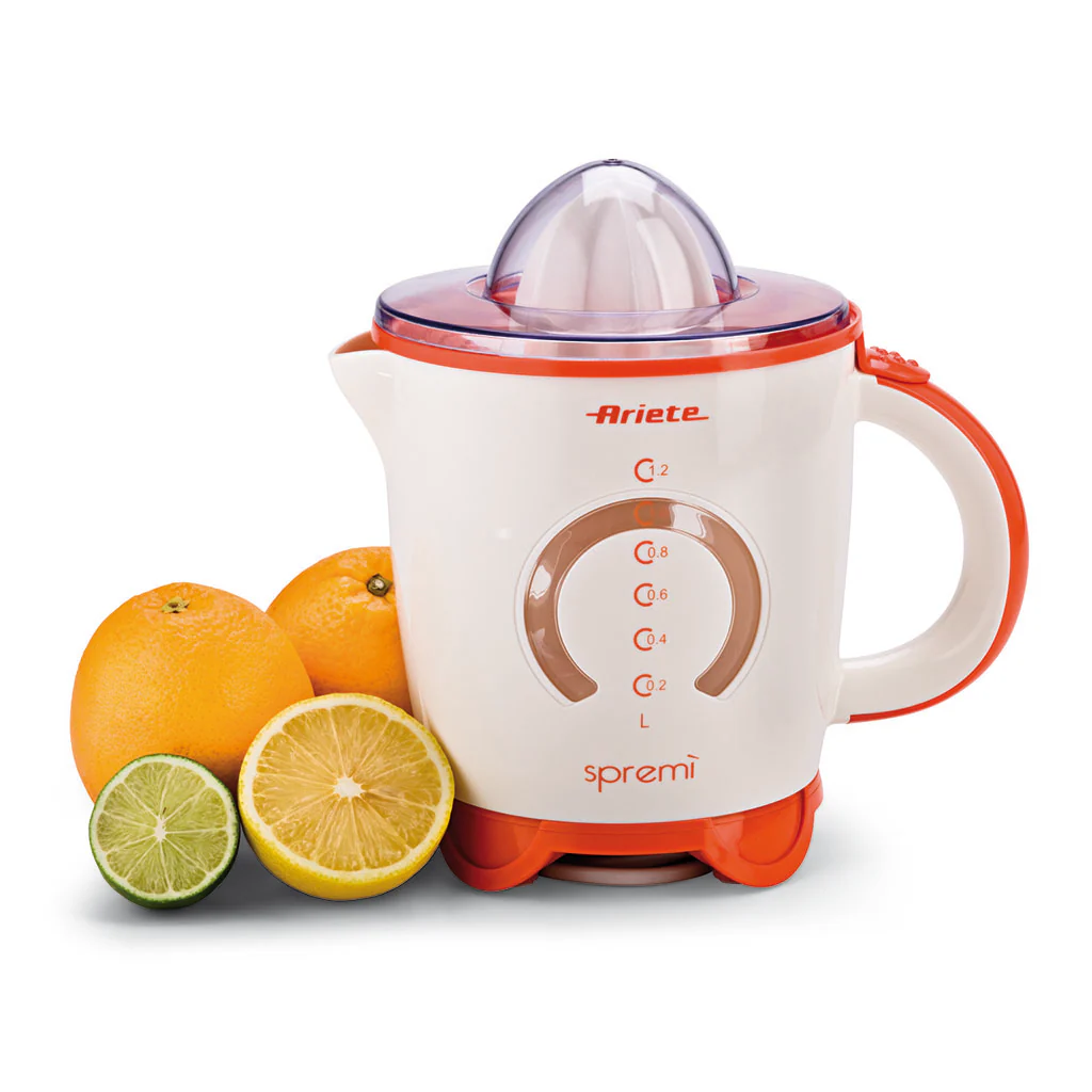 Con su 1,2 litros de capacidad, el Exprimidor Spremì Ariete te permitirá exprimir, ¡sin parar!, las naranjas que necesitas para el zumo del desayuno de toda la familia. Su cómodo diseño de jarra con asa y pico vertedor te permitirá servir el jugo en los vasos en un santiamén. Este exprimidor eléctrico dispone de dos conos intercambiables para que puedas exprimir desde limones a pomelos. Y gracias a su doble sentido de rotación, extraerá hasta la última gota de jugo de las frutas.