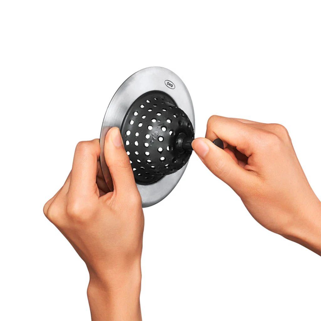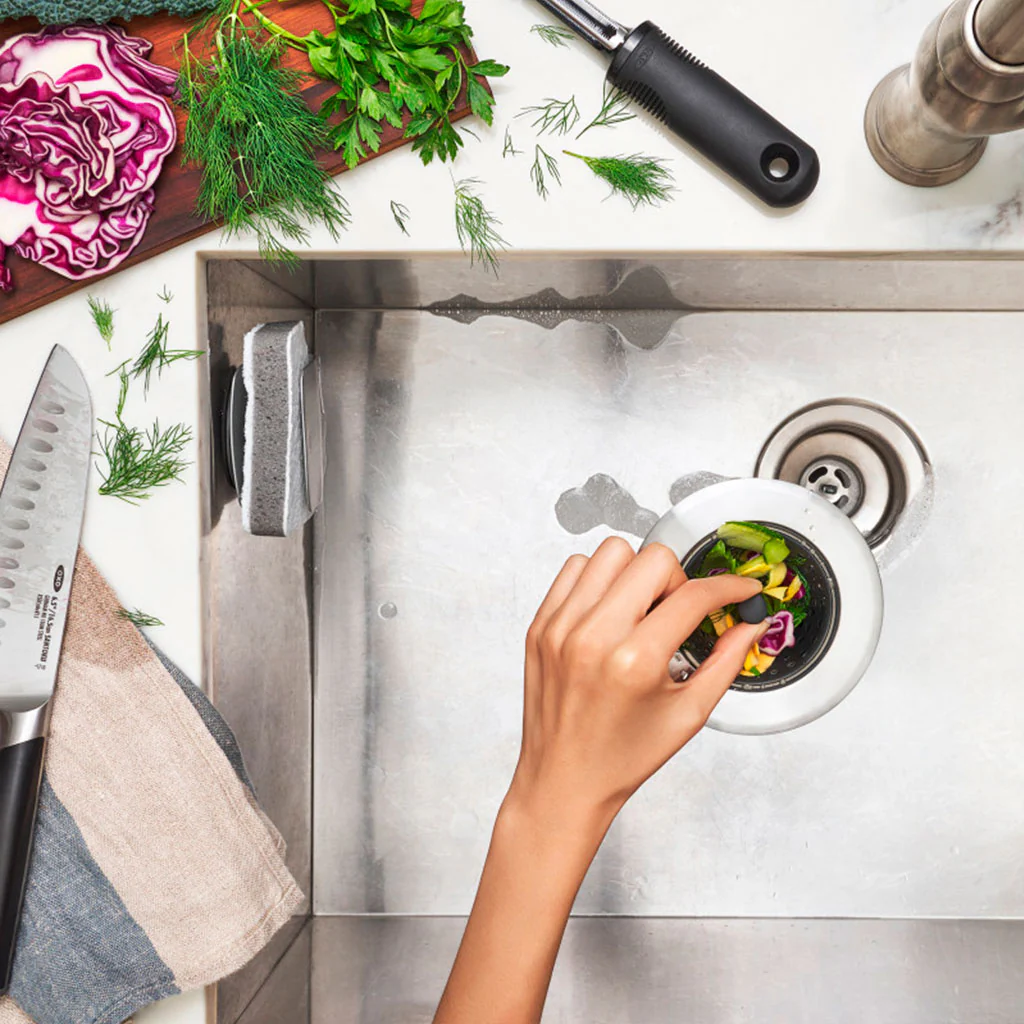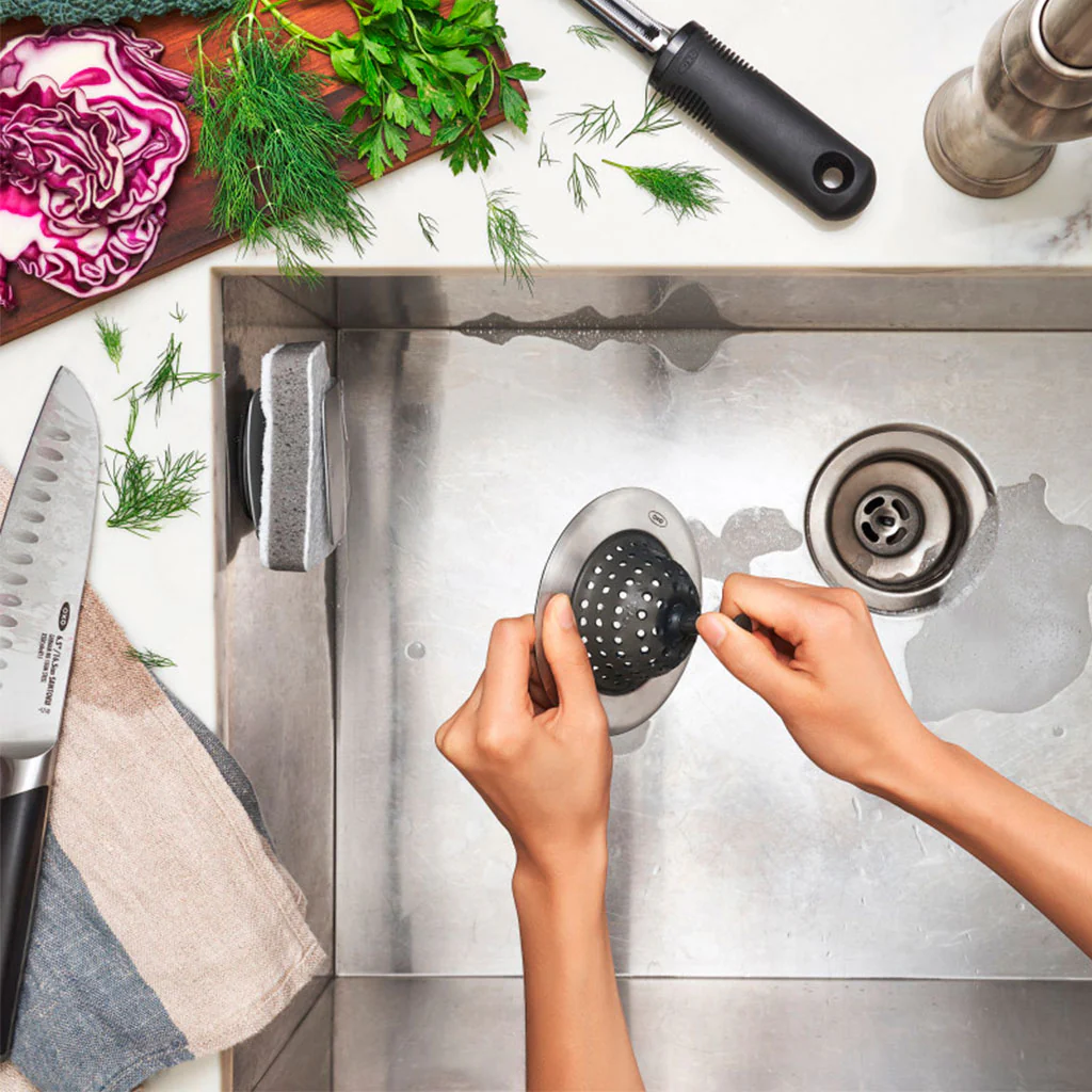 El Filtro desagüe de silicona OXO es un complemento perfecto para tu cocina. Este aro de acero inoxidable con filtro perforado de silicona te ayudará a atrapar los restos de alimentos que quedan en la pila de fregar al escurrir los alimentos o lavar los platos, ollas, cazuelas o sartenes. La silicona del filtro es flexible, para poder retirar los restos sin problemas, y rodea toda la base del aro de acero, para no rayar el fregadero.