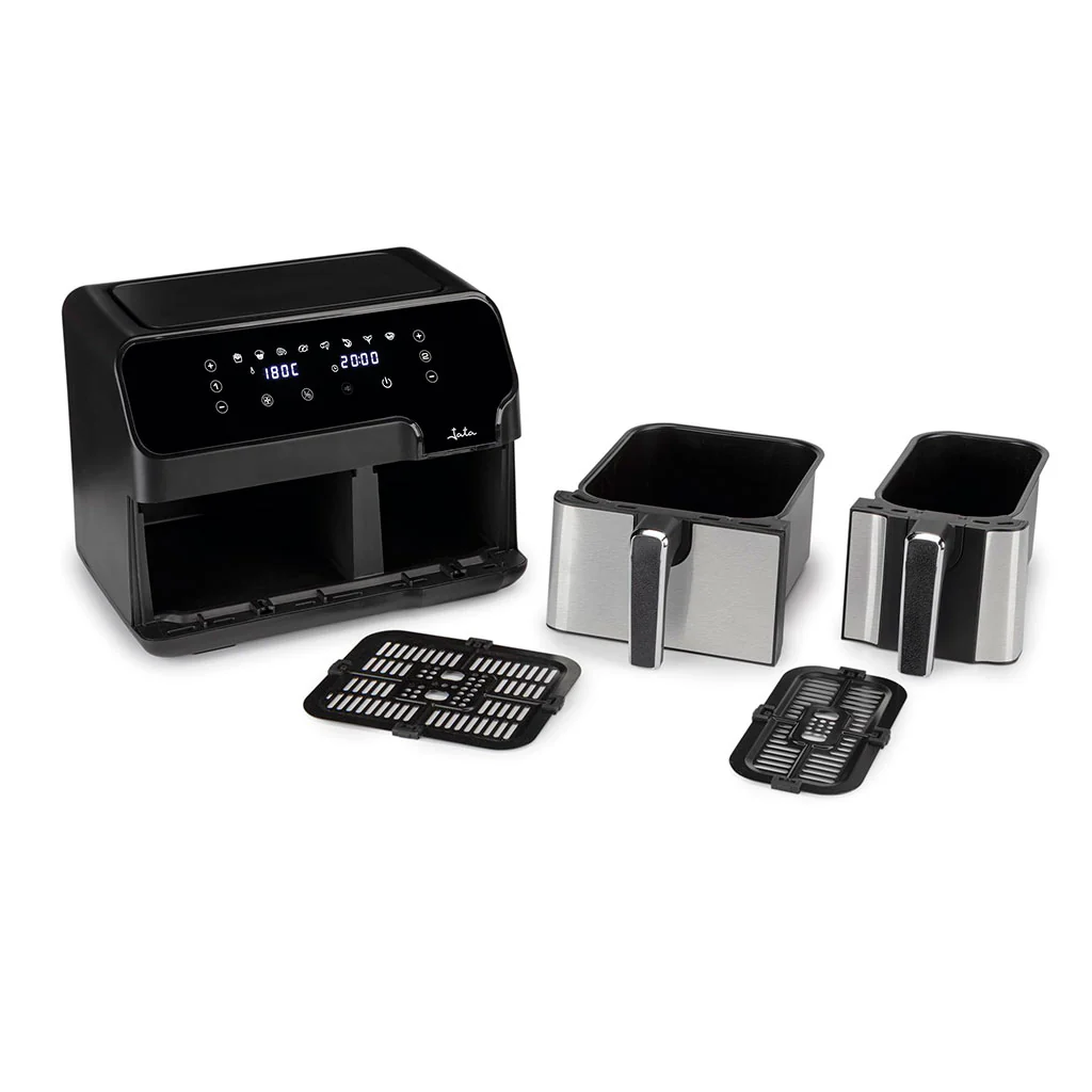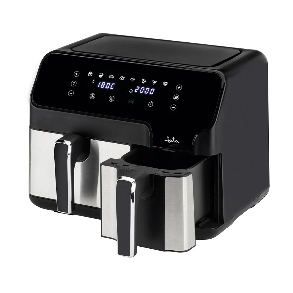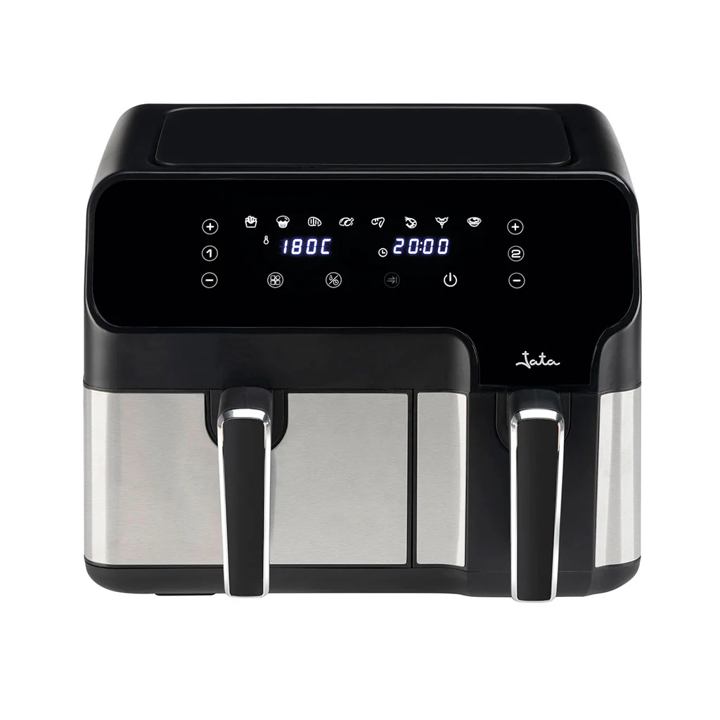 La Freidora de aire programable dos cubetas de Jata cambiará tu forma de cocinar, ¡porque es un gran invento! Sus dos cubetas independientes de distinta capacidad son ideales para usarlas por separado o las dos al mismo tiempo. Con una gran versatilidad y una capacidad de 9 litros, ¡podrás cocinarlo todo!