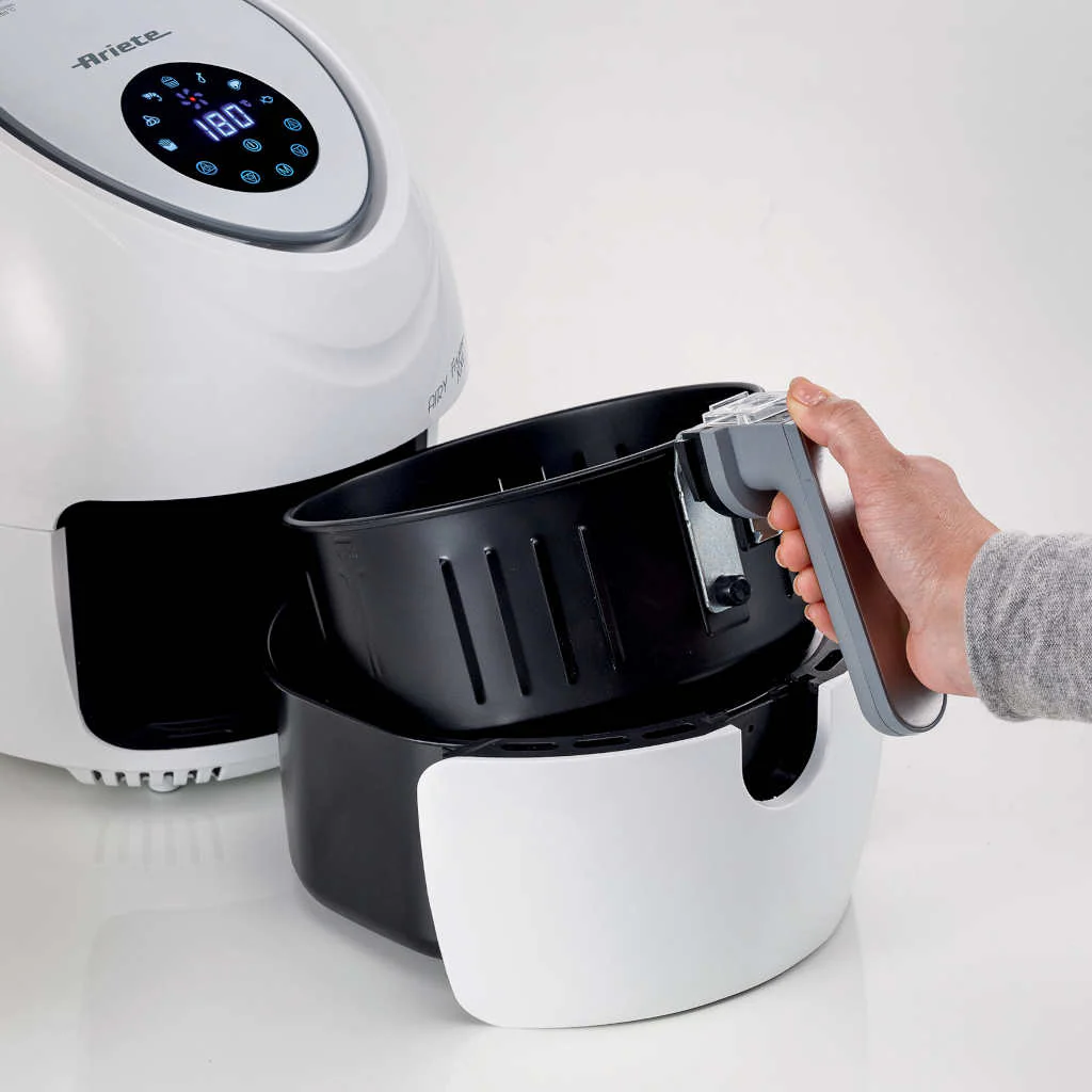 Con una capacidad de 5,5 litros, la Freidora de aire XXL Ariete será tu mejor ayudante en la cocina. Perfecta para familias grandes, para grandes chefs o para preparar el batch cooking de toda la semana, esta air fryer es perfecta para preparar frituras ricas y saludables y también todo tipo de platos de forma ágil, fácil y eficiente, gracias a la uniforme y rápida circulación de aire caliente en el interior de la cesta.