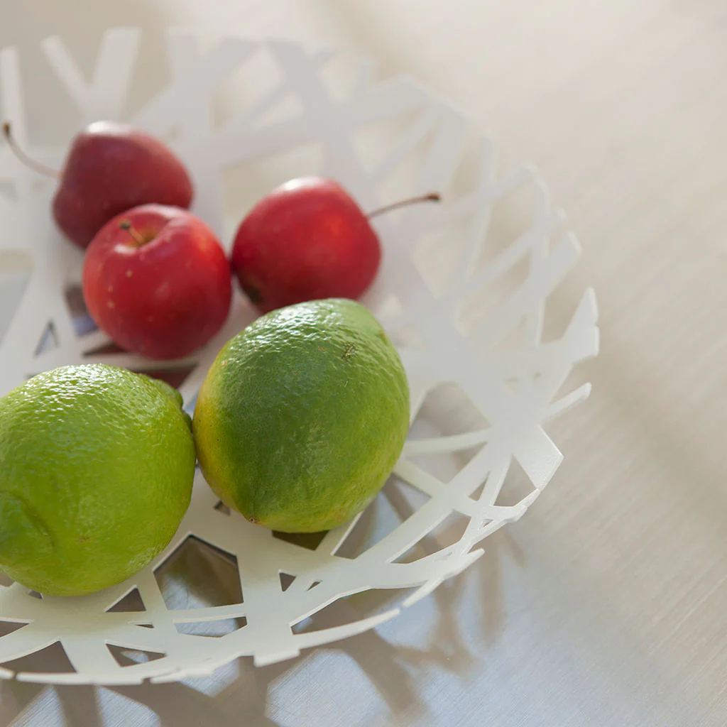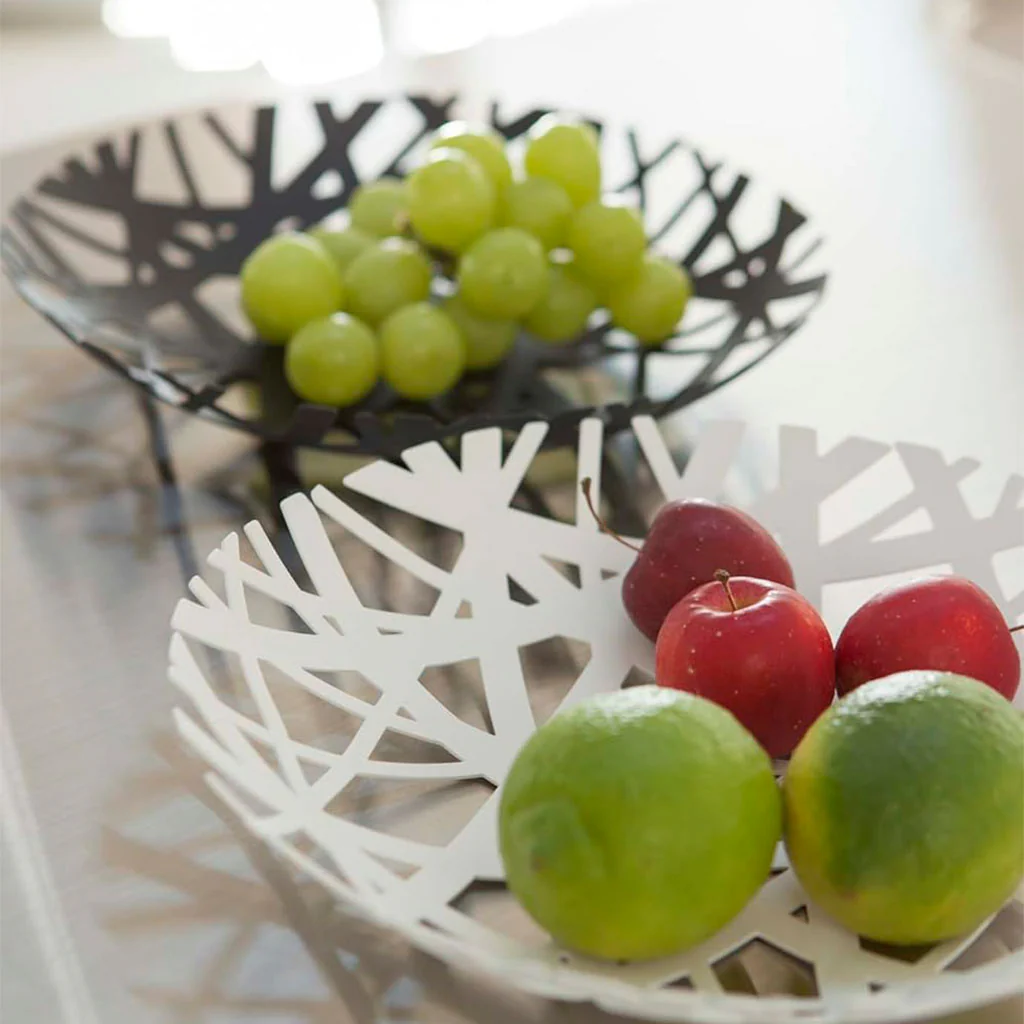 - Con un diseño minimalista en acero blanco y abierto, mantiene frutas frescas en todo momento.