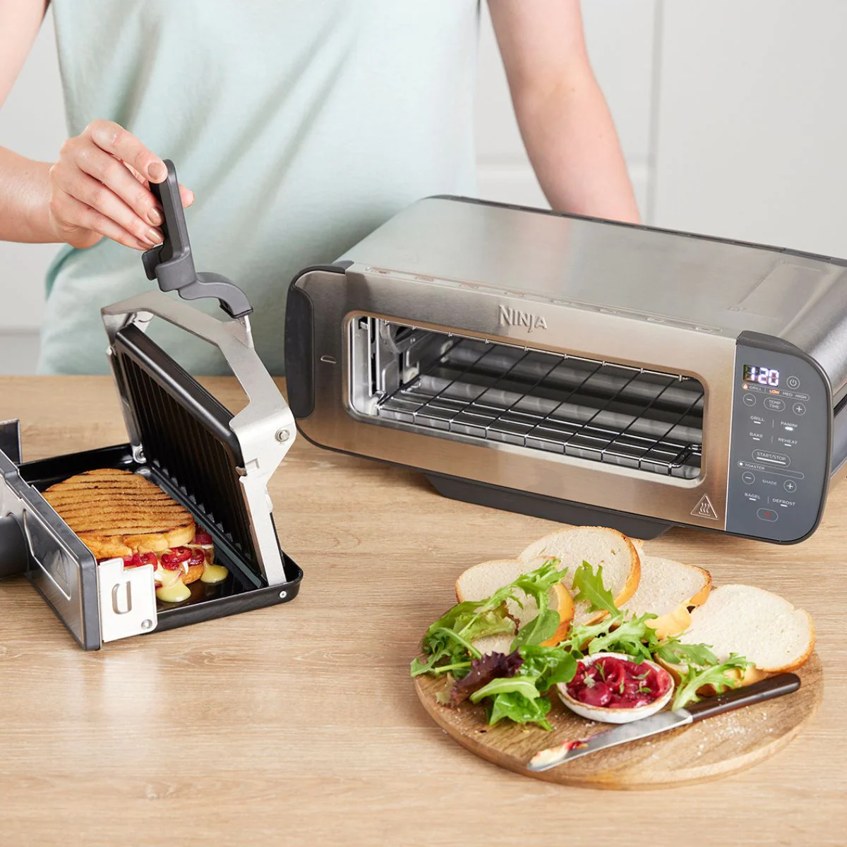 - Como sandwichera. ¿Unos bocadillos para la merienda? Gira la tostadora y coloca la bandeja para hornear con el accesorio grill. Vas a preparar tus mejores sándwiches, marcados en parrilla, tostados y crujientes, rellenos de tus ingredientes favoritos. ¡Verás qué delicia!