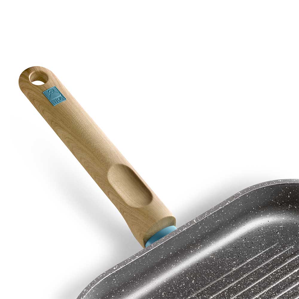 - Mango ergonómico termoaislante en imitación madera con cuerpo exterior y logo de BRA en azul hielo.