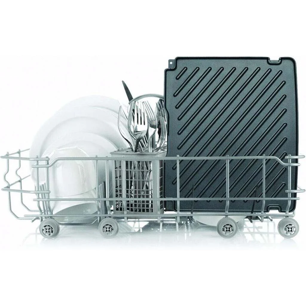 - Las placas extraíbles son también reversibles. Y puedes limpiarlas en el lavavajillas, igual que la bandeja de goteo, que recoge la grasa mientras se cocinan los alimentos.
