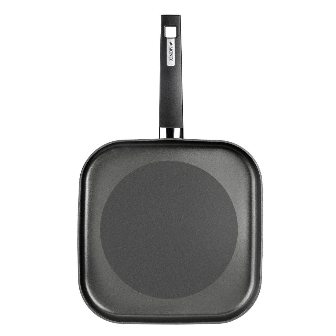 Se trata de una sartén cuadrada y lisa de 28×28 cm, fabricada en aluminio estampado y con un antiadherente libre de PFOA. Dispone de un espesor de 3mm y un mango termorresistente, con el que manipular la sartén sin quemarte.