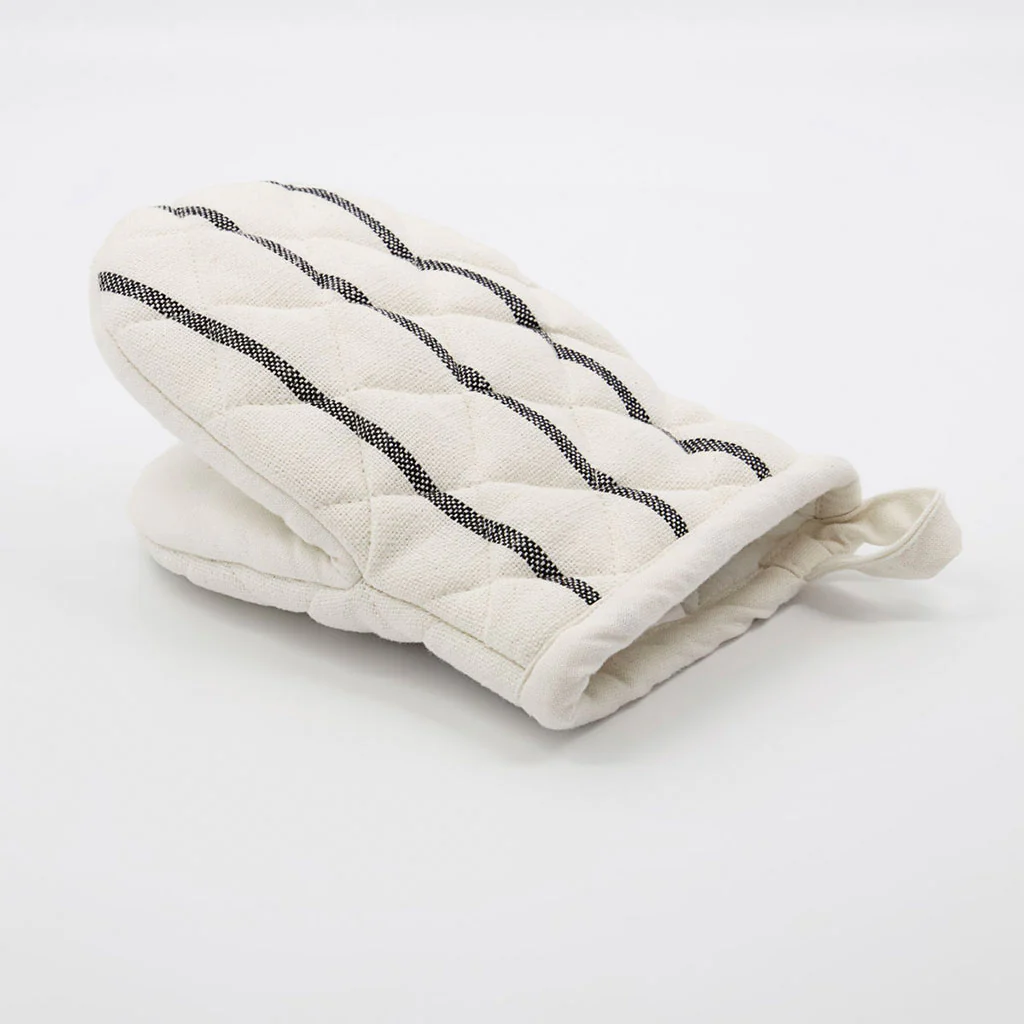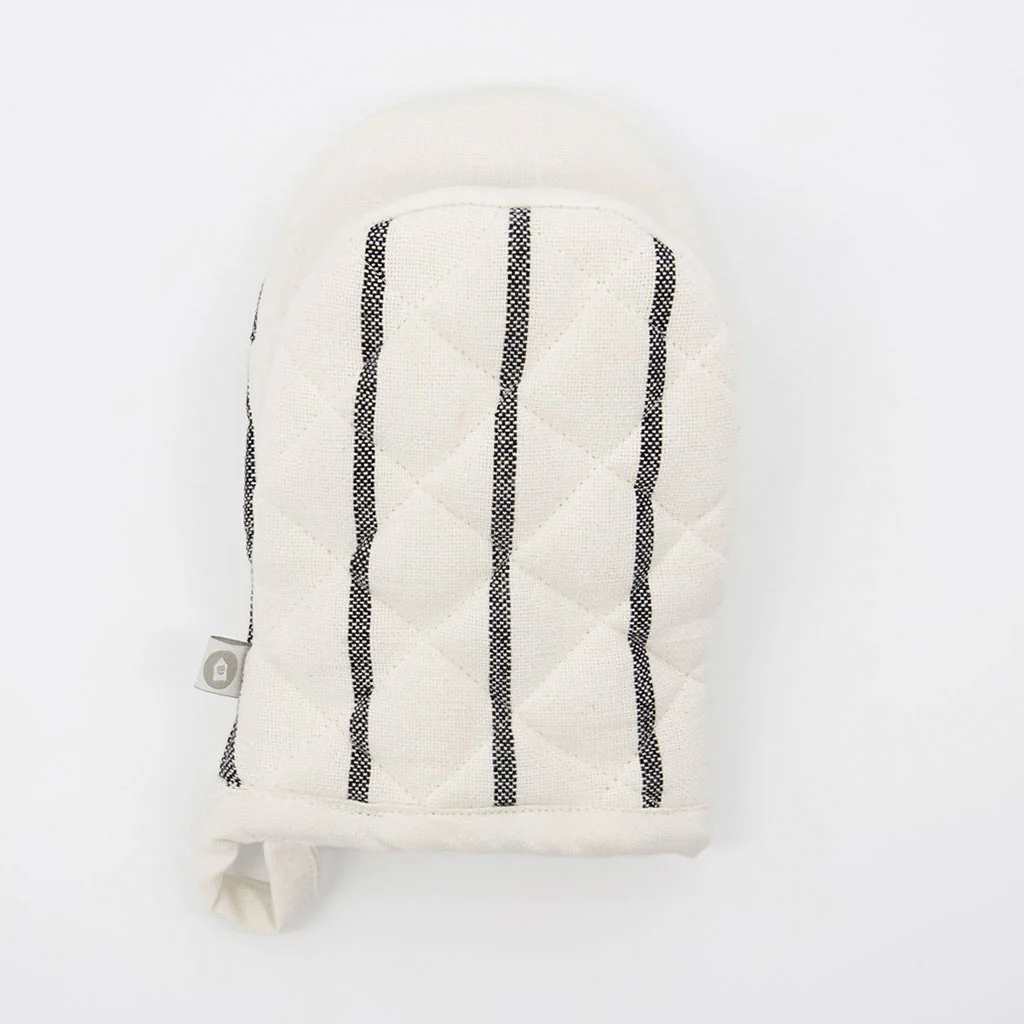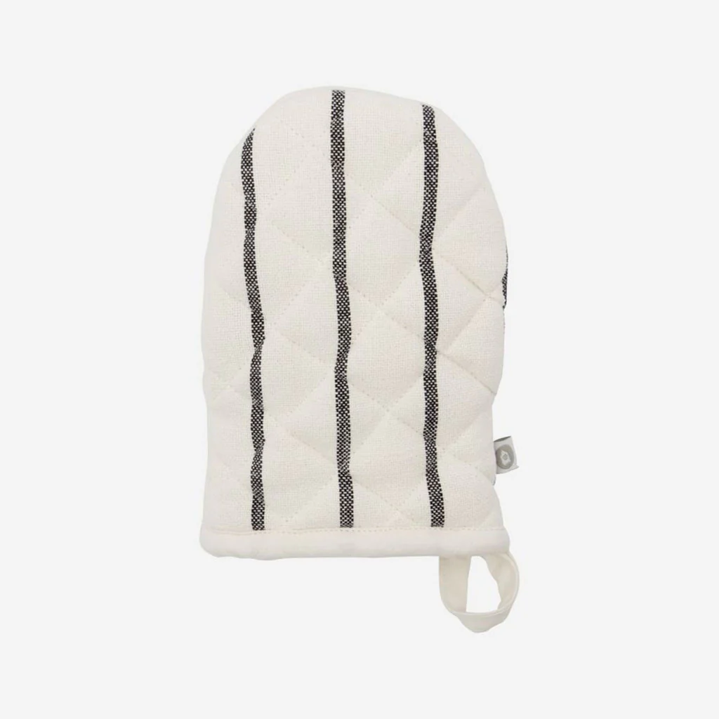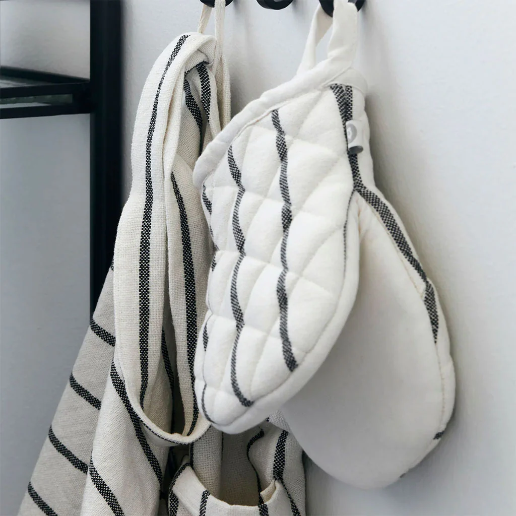 El guante dispone de una beta para poderlo colgar y tenerlo siempre a mano. Está confeccionado en algodón certificado OEKO-TEX® 100, y tiene un elegante estampado a rayas en la superficie exterior.