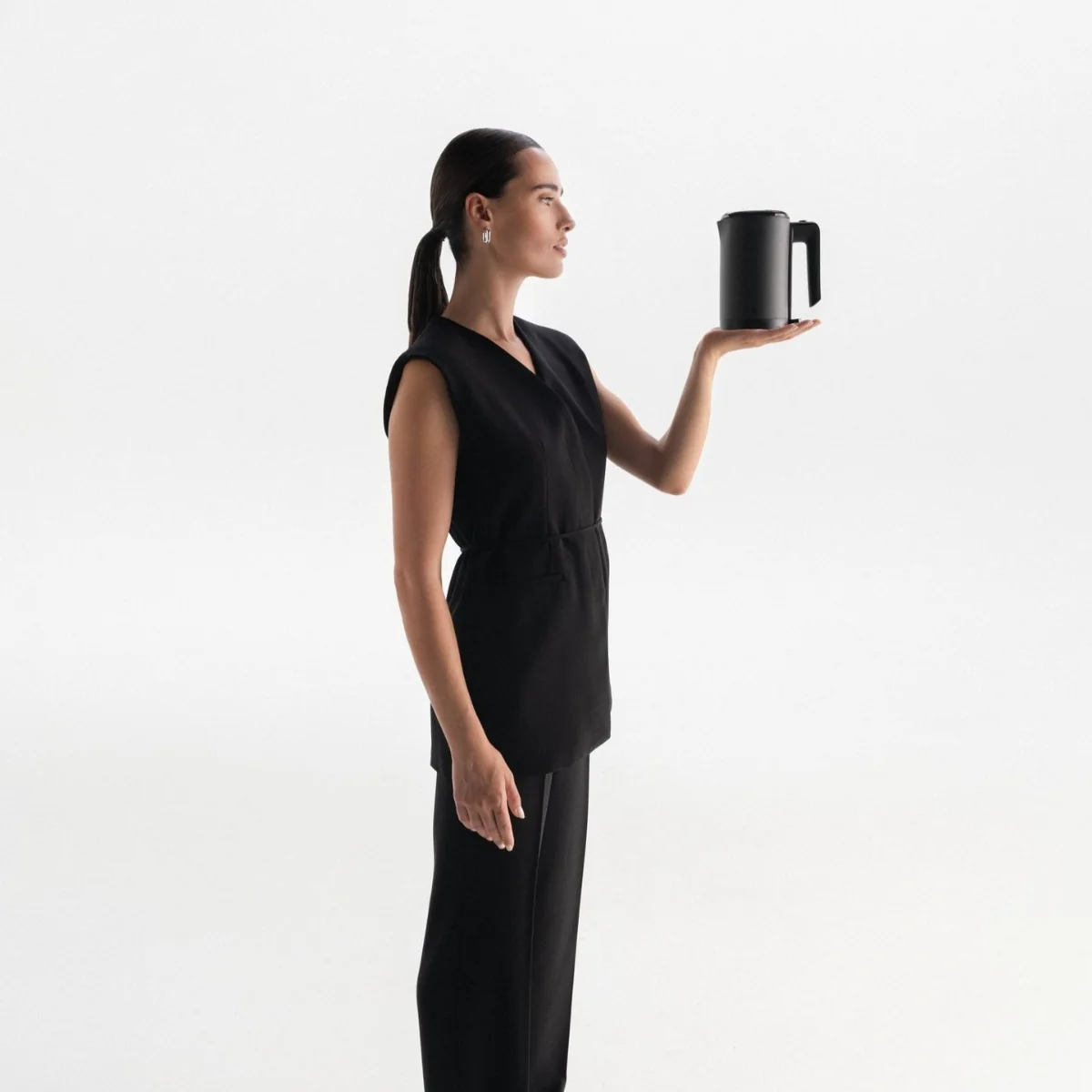 Gracias a su cuerpo de acero inoxidable de doble pared, mantiene por más tiempo el agua caliente, incluso estando apagado o fuera de la base, ya que la doble pared actúa a modo de termo. La rueda de la base permite ajustar la temperatura, con solo girarla se aumenta en 5 grados cada vez. Su diseño es sobrio y minimalista y hace que el hervidor destaque por su elegancia. La tapa de cristal de toque frío dispone de botón de apertura fácil integrado en el mango de aluminio.