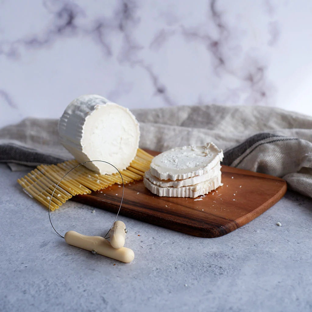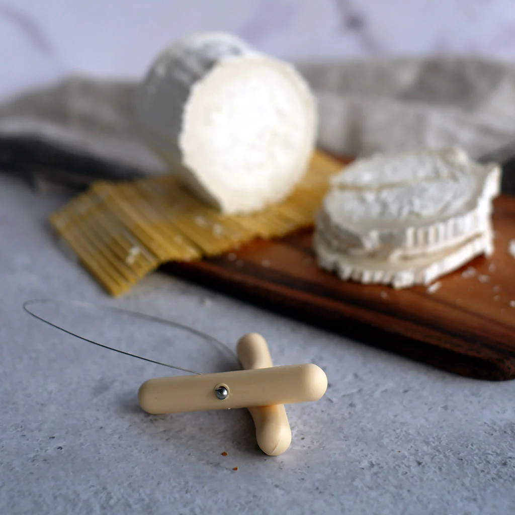 Para usarlo tan solo has de tensar el hilo tirando de sus extremos y tendrás una lira perfecta para cortar la mantequilla, unos medallones de foie, de rulo de cabra o porciones de queso tierno. O bien puedes envolver el taco de mantequilla con el hilo en caso de mantequillas circulares, y podrás usarlo a modo de guillotina.