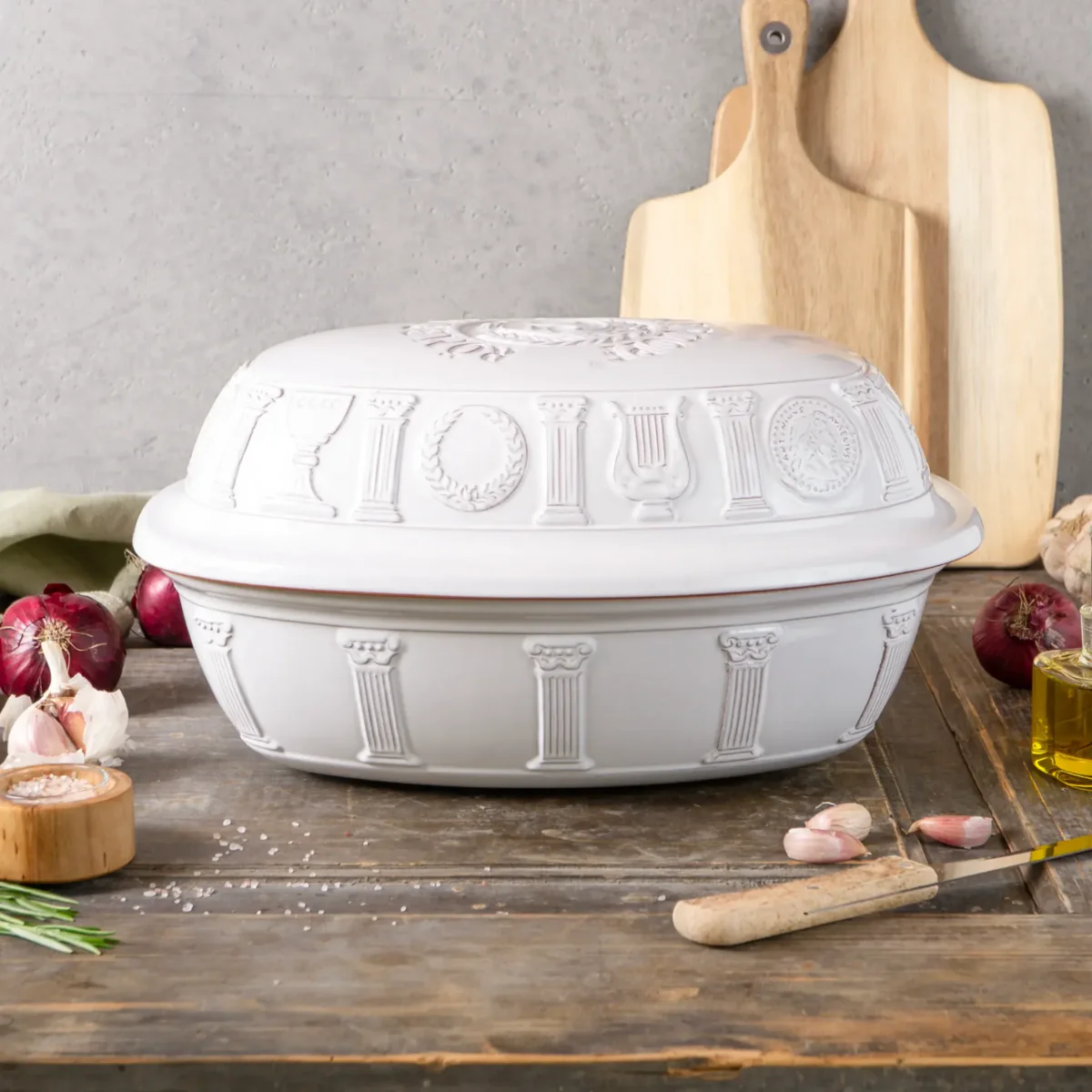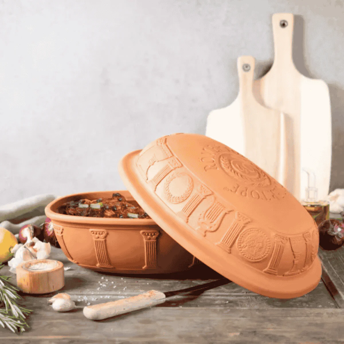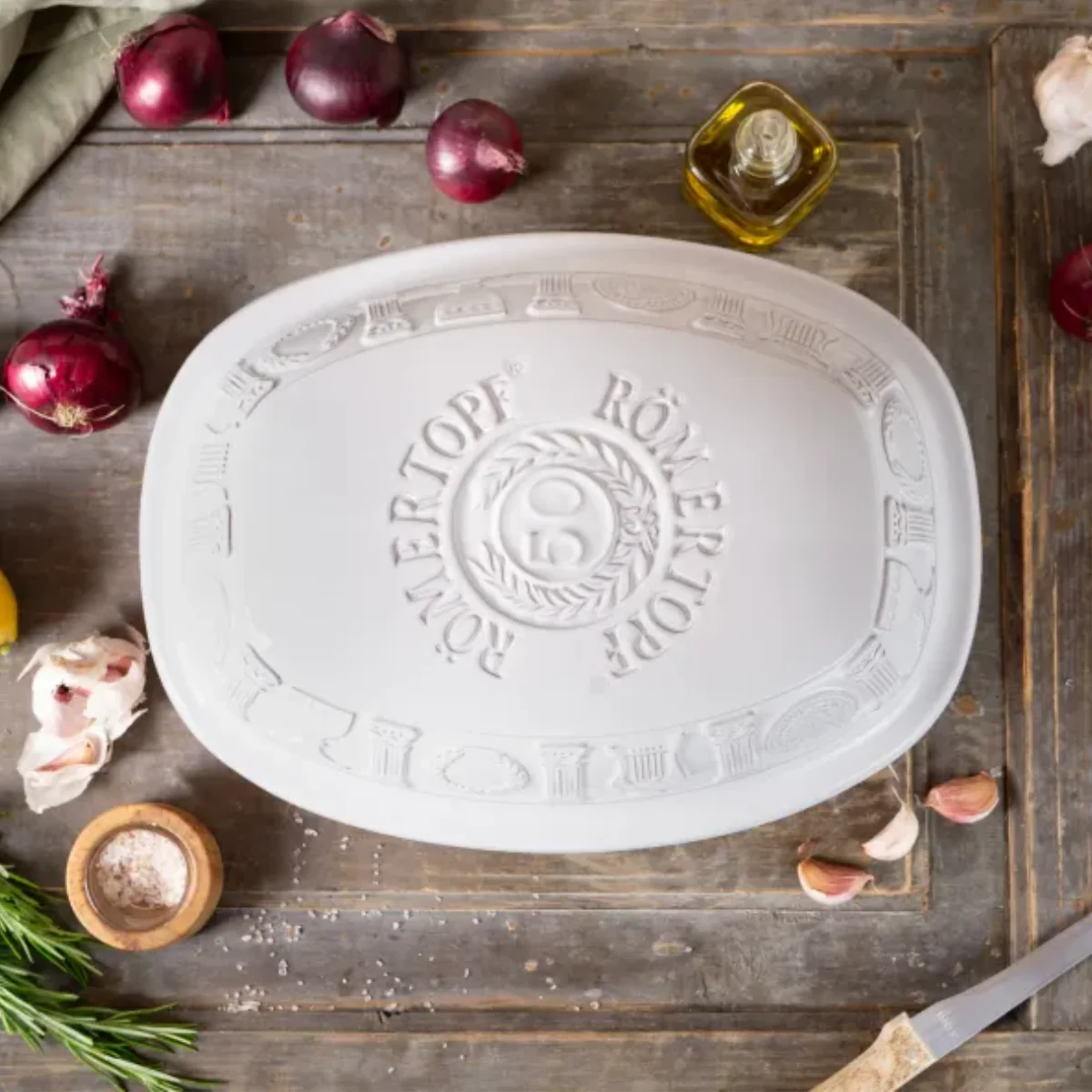 Funcionalidad, tradición y modernidad se dan la mano con el Horno de terracota ¡Especial Aniversario! Römertopf. Fabricado en Alemania y con el diseño tradicional de los hornos de arcilla de la marca alemana, esta edición especial de aniversario destaca por sus elegantes relieves clásicos inspirados en la antigua Roma. Este asador ovalado transforma los alimentos de forma maravillosa y es una pieza ideal para hacer pan y cocinar sano, con todo el sabor, aroma y nutrientes de los alimentos, de la forma más cómoda y sencilla que puedas imaginar. Y su diseño único inspirado en la antigüedad, lo hace ideal para llevarlo a la mesa, recién salido del horno.