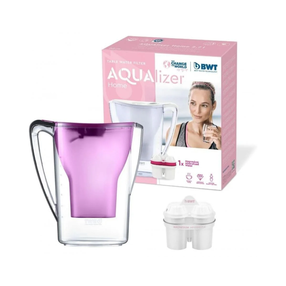 Disfruta del agua más saludable y con mejor sabor, con la Jarra Aqualizer Home BWT. En apenas unos segundos, directamente del grifo y sin tener que cargar con las botellas de plástico, tendrás tu agua potable filtrada y mineralizada, con menos residuos, impurezas y metales pesados, gracias a su innovadora tecnología de filtrado de magnesio patentada. Ganarás en salud, ahorrarás más y contribuirás a reducir los residuos plásticos. Si el agua es vida, esta jarra lleva la vida saludable a tu mesa.
