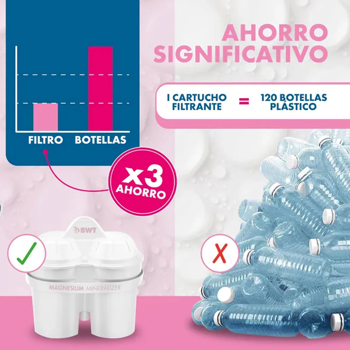 - Es mucho más sostenible. El sistema de agua filtrada BWT no solo te permitirá olvidarte de las botellas de plástico de un solo uso, sino que contribuye a proteger el medio ambiente y reducir los residuos plásticos.