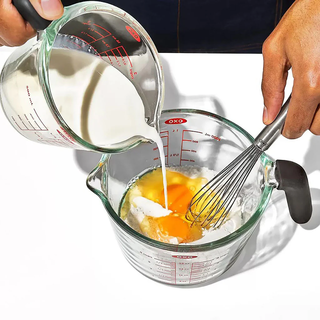 Perfecta para medir, preparar y mezclar ingredientes, la Jarra medidora de vidrio OXO se convertirá en una compañera imprescindible en tu cocina. Su funcional diseño, con asa y pico vertedor antigoteo, su construcción en resistente vidrio de borosilicato y su escala medidora, te facilitarán la preparación de todo tipo de recetas. Gracias a su gran abertura, verás en todo momento el interior al mezclar, emulsionar o batir. Y su amplia base la mantendrá estable mientras la usas.