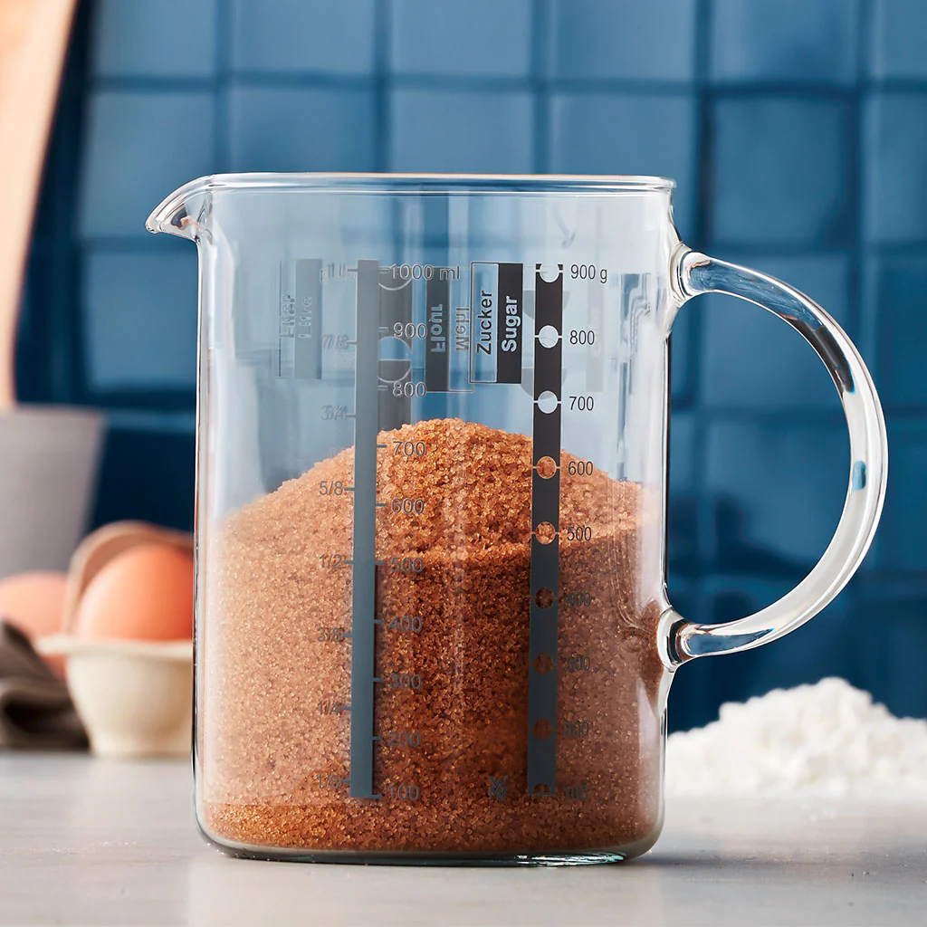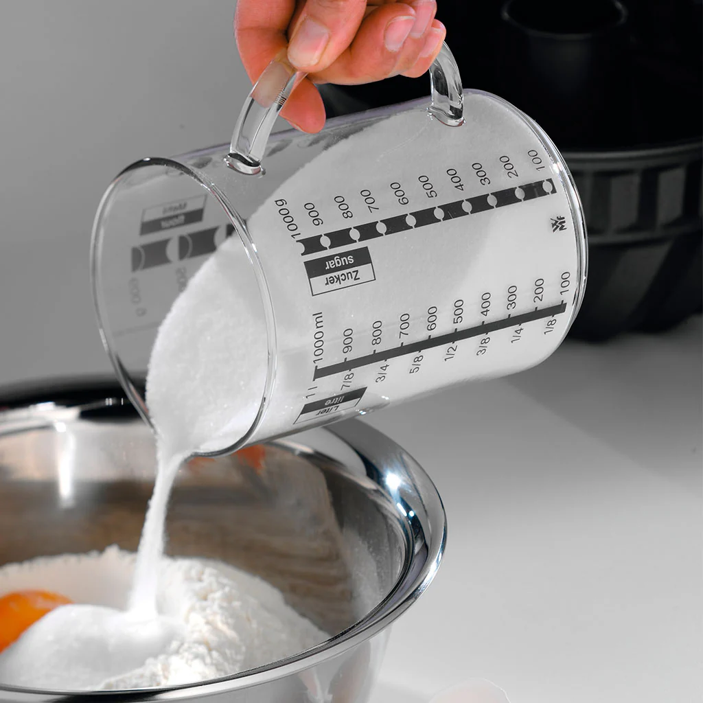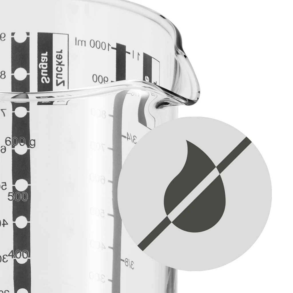 Las marcas de medición actúan como una precisa báscula para ingredientes secos como el azúcar (zucker/sugar) o la harina (mehl/flour). De esta forma, sea cual sea la receta que prepares, la jarra medidora te ayudará a ganar tiempo y te facilitará enormemente la preparación de tus recetas.