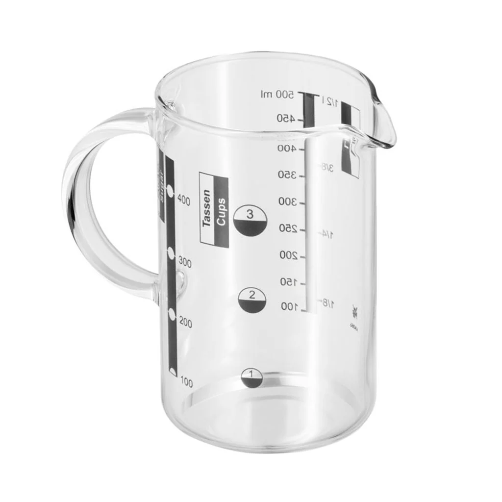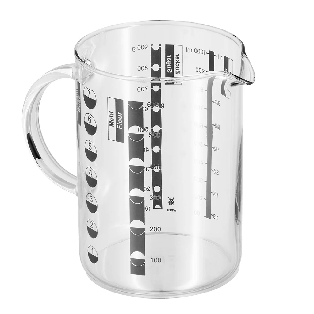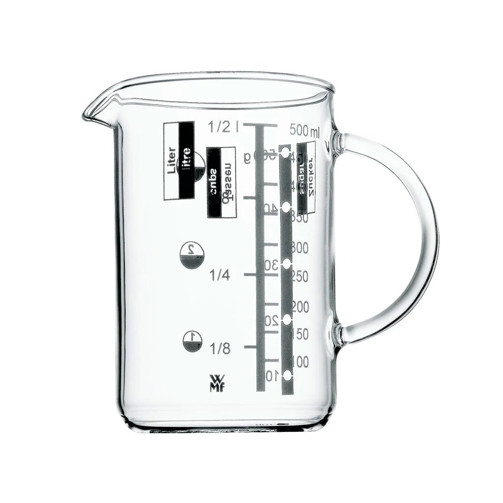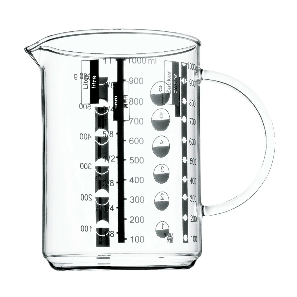 Con la Jarra medidora de WMF tendrás un ayudante de lujo en la preparación de tus recetas. Este vaso medidor de vidrio con asa y pico vertedor te facilitará la tarea de medir el contenido de los líquidos y también de los sólidos. Dispone de una escala medidora para las principales medidas en que se presentan las recetas: litros, mililitros, tazas, gramos de harina y de azúcar.