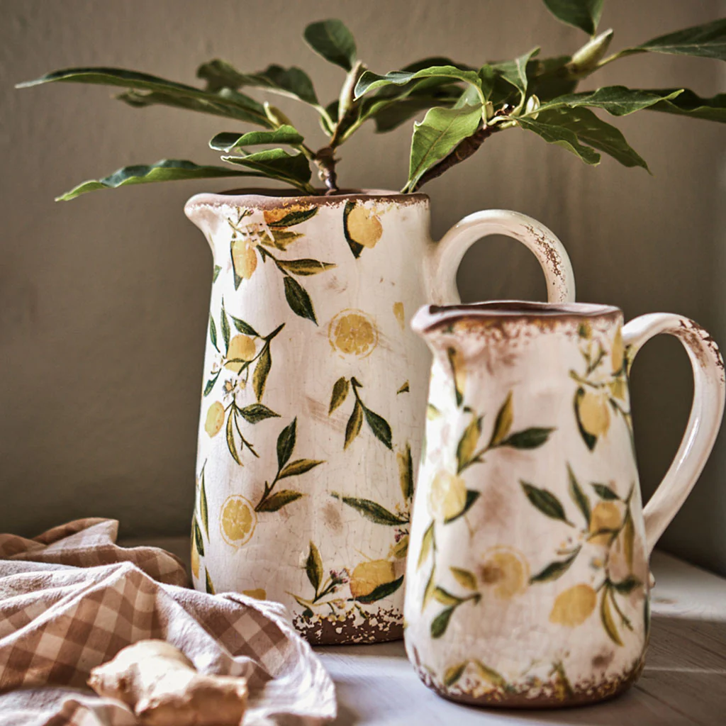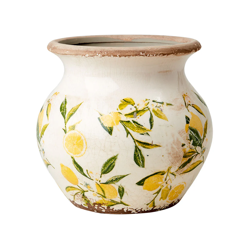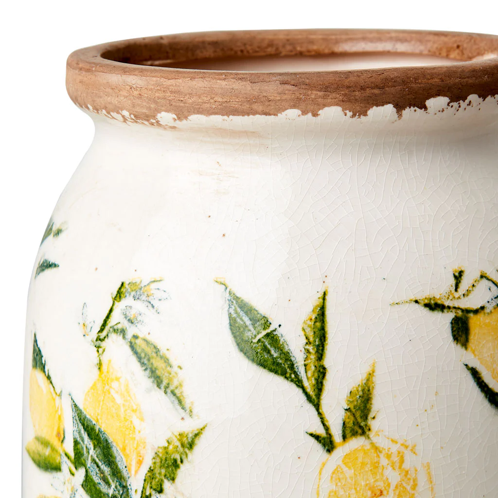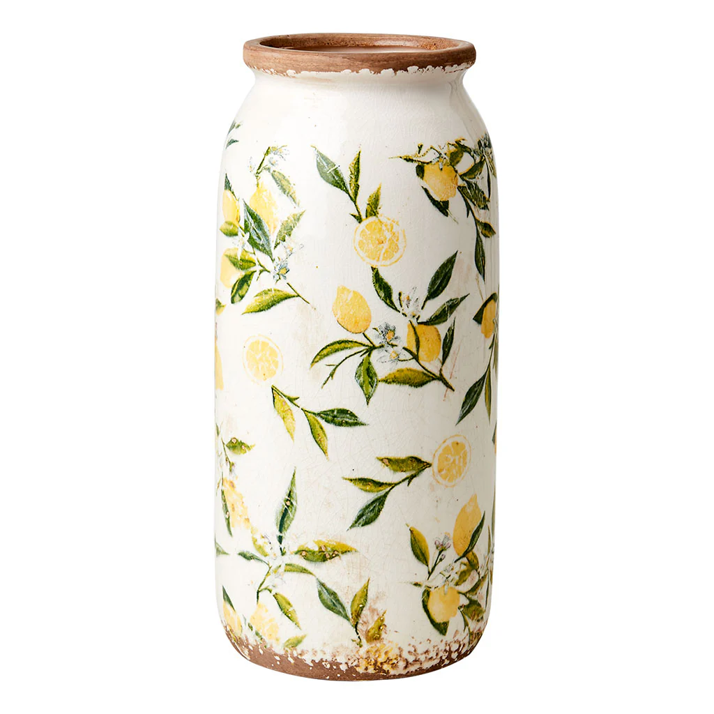 Con los colores verde y amarillo de las hojas y frutos del limonero sobre su fondo blanco, este jarrón es un elemento decorativo de lo más rústico y encantador, en cualquiera de sus dos formatos:
