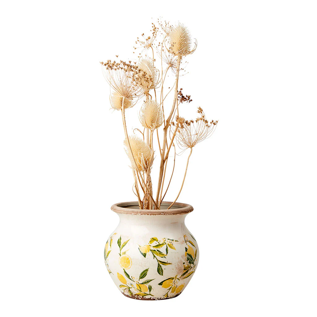 El Jarrón Lemona de Affari of Sweden es una vasija de cerámica que lucirá preciosa allí donde quieras colocarla. Ya sea con un ramo de flores, a modo de macetero para tus plantas o tal cual sobre la mesa del comedor, el bonito diseño de este jarrón en cualquiera de sus dos formatos y la frescura de sus estampados con motivos de limones, llenará de luz y harmonía la estancia en la que esté.