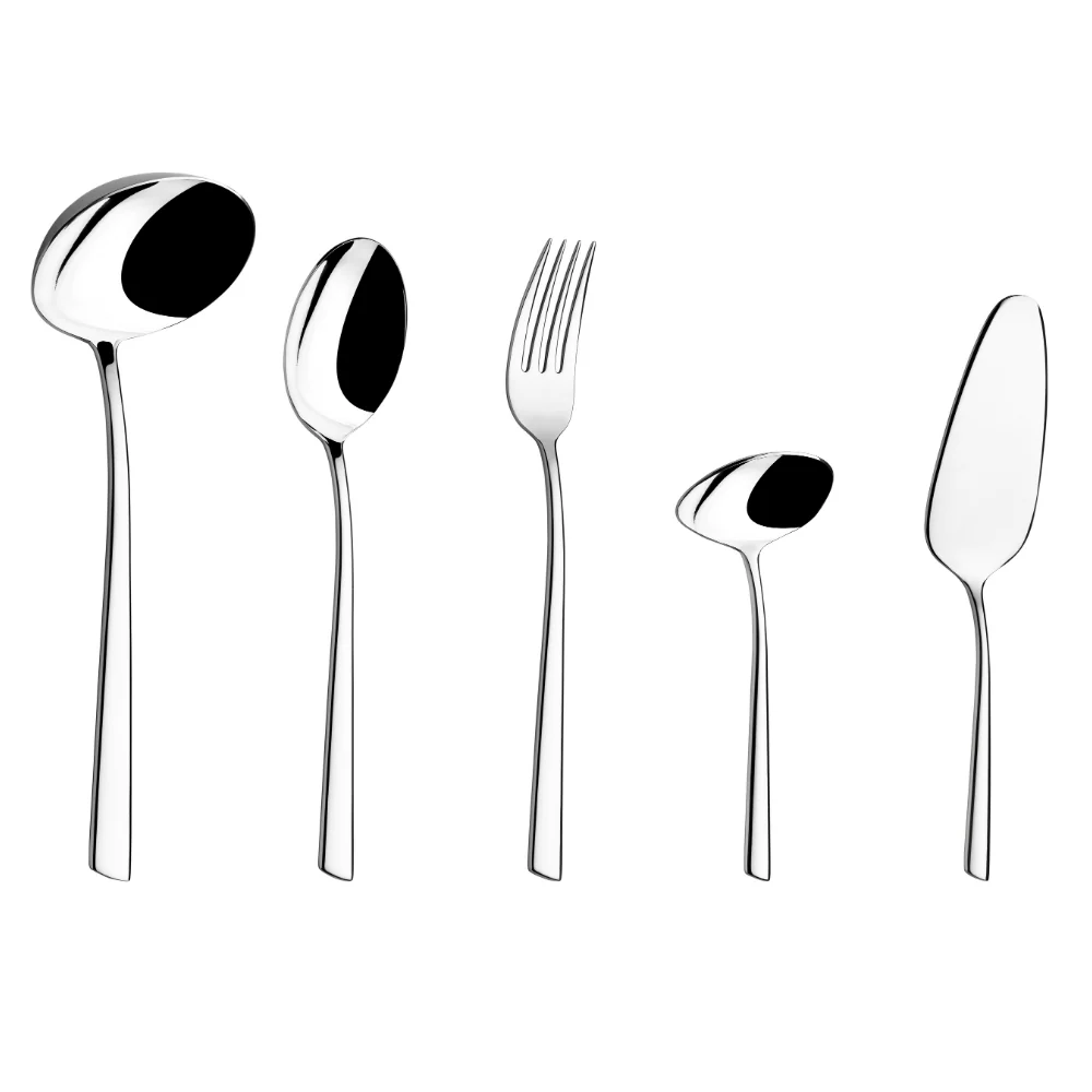 - El juego de 75 piezas incluye: cucharas de mesa, tenedores de mesa, cuchillos chuleteros, cuchillos de postre, tenedores lunch, cucharas de café, cazo de sopa, cuchara de servir y tenedor de servir.