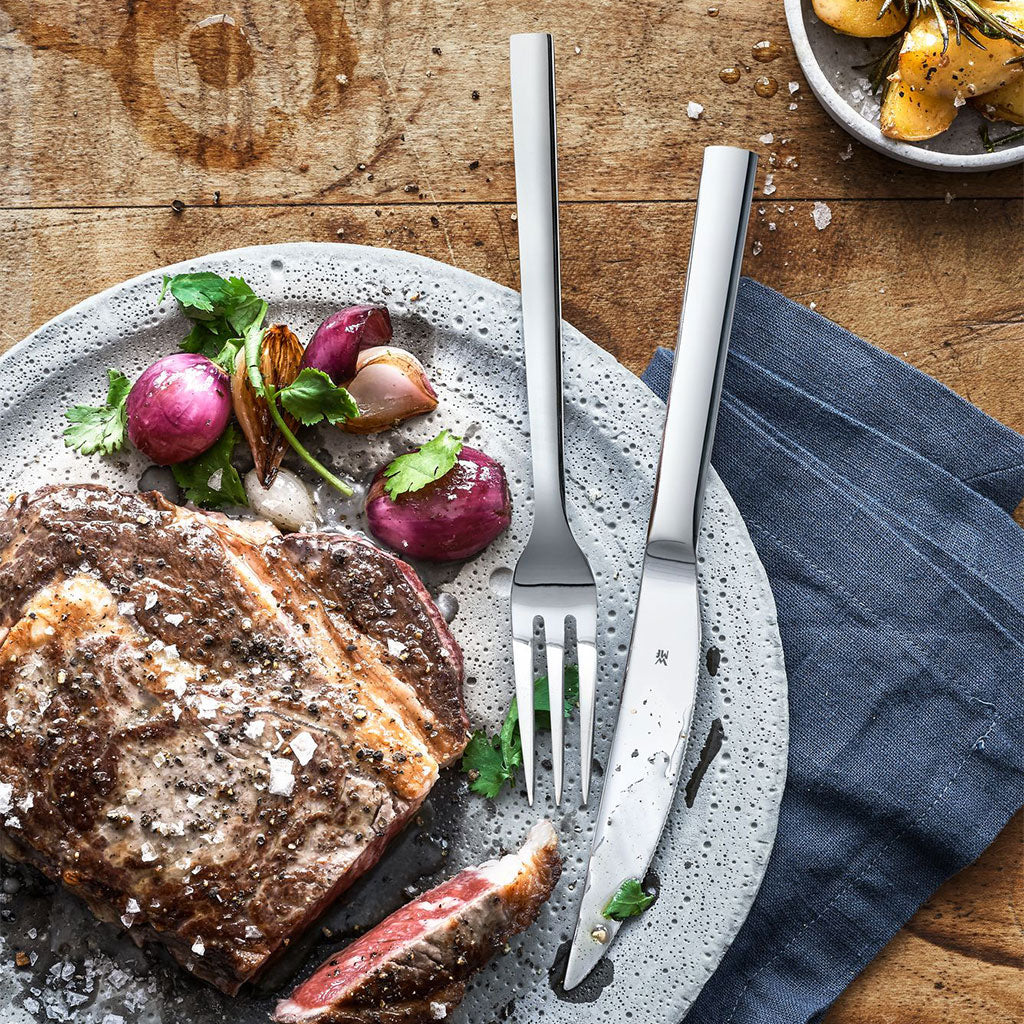 Elegante y funcional, el Juego de 12 piezas para carne Nuova de WMF es un set ideal para los amantes de la carne. Este conjunto de seis servicios está formado por doce cubiertos de acero inoxidable de gran calidad y durabilidad. El juego incluye 6 cuchillos de filo serrado, especiales para cortar el chuletón, y 6 tenedores que lo pincharán fácilmente, para que tu única preocupación sea acabarte la pieza.