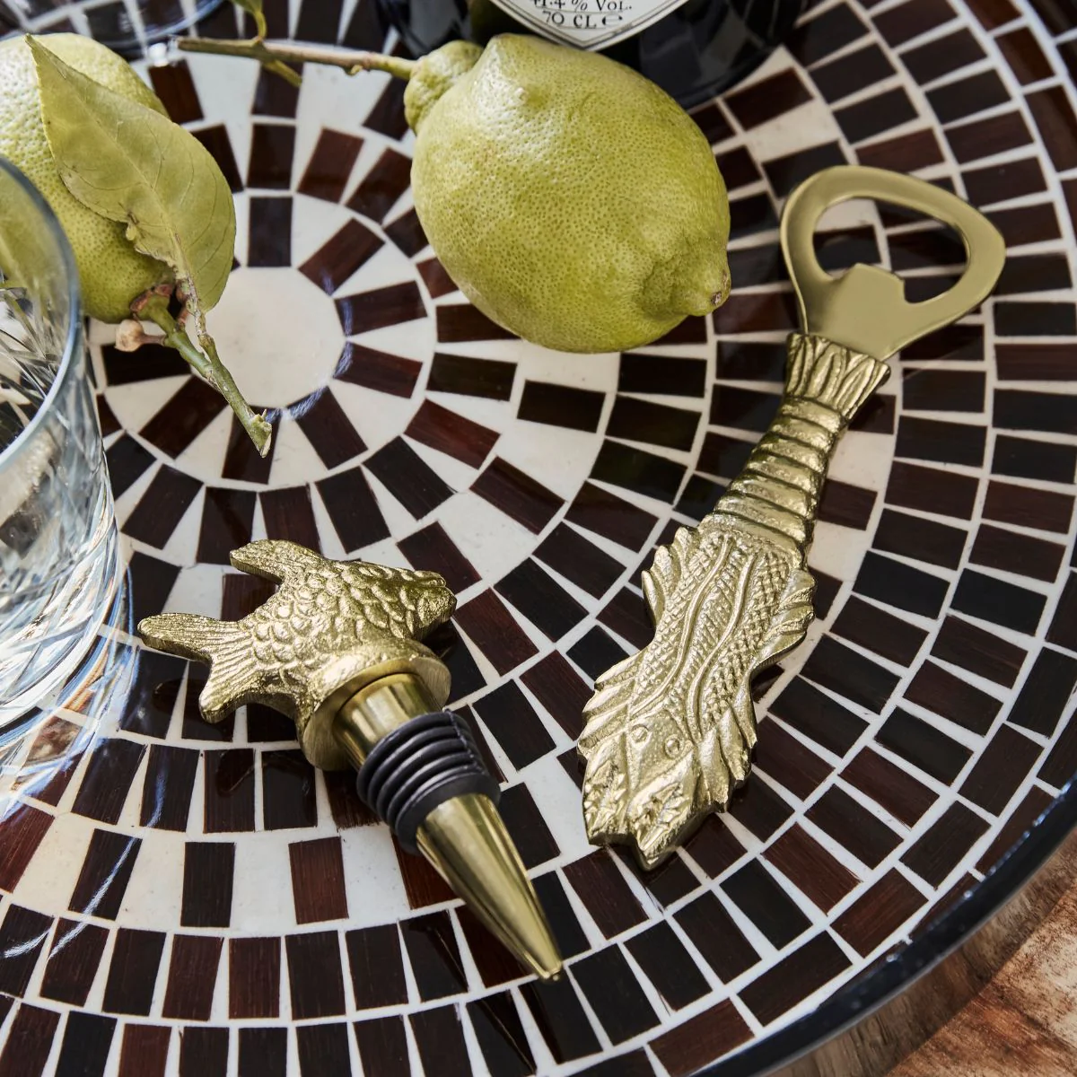 Este Juego de 2 accesorios para el vino Fish House Doctor es un set de 2 piezas imprescindible en tu mueble bar. Es juego está formado por un abridor de tapón corona y un tapón de botellas. Ambos accesorios son de acero inoxidable y aluminio y tienen un elegante acabado en color oro antiguo, con un diseño de inspiración marina. El abridor de chapas muestra una graciosa langosta y el tapón, un pez con su aleta dorsal levantada. El tapón es perfecto para mantener el vino en perfecto estado, gracias a su tope de silicona negra.