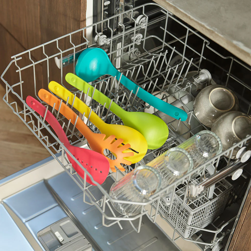 El conjunto está formado por una espátula ranurada, una cuchara para pasta, una cuchara ranurada, una cuchara para servir y un cucharón. Todos los utensilios están fabricados con nailon endurecido en una sola pieza, por lo que son muy higiénicos. Son perfectos para usar en cualquier olla, cazuela, cazo o sartén, incluso en las antiadherentes. Además, podrás utilizarlos en la preparación de tus recetas, ya que son resistentes a temperaturas de hasta 200 °C.