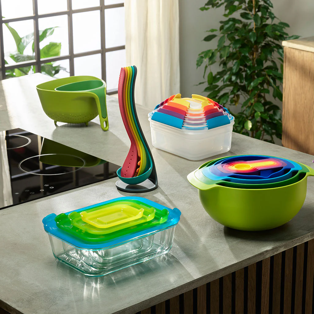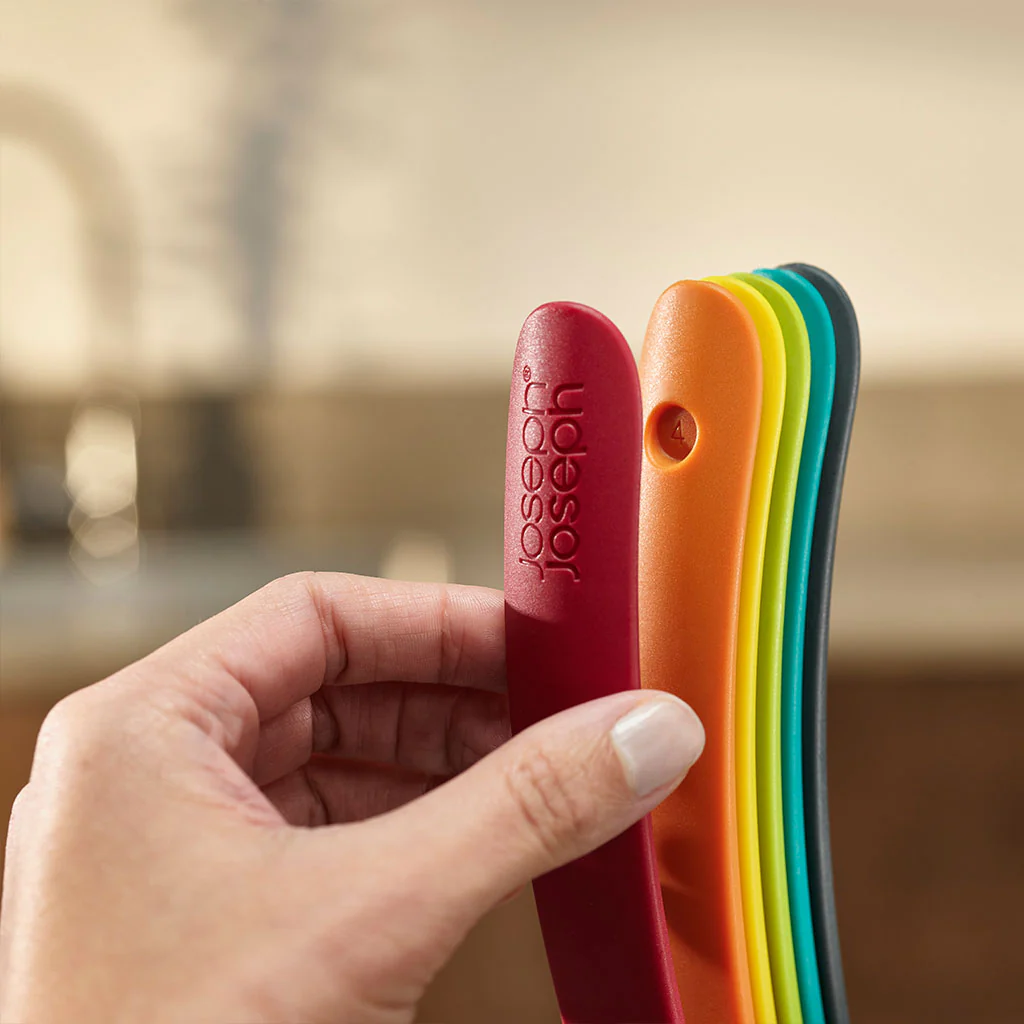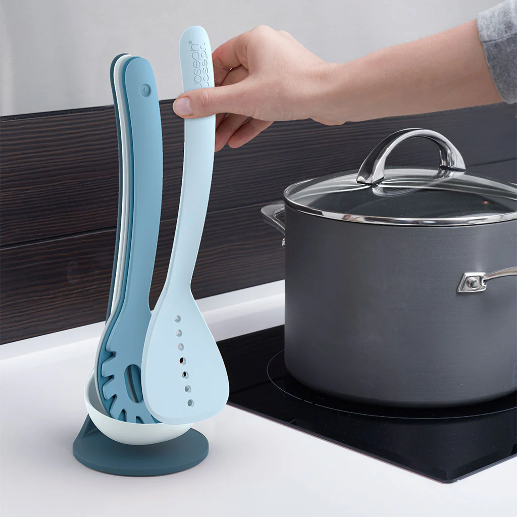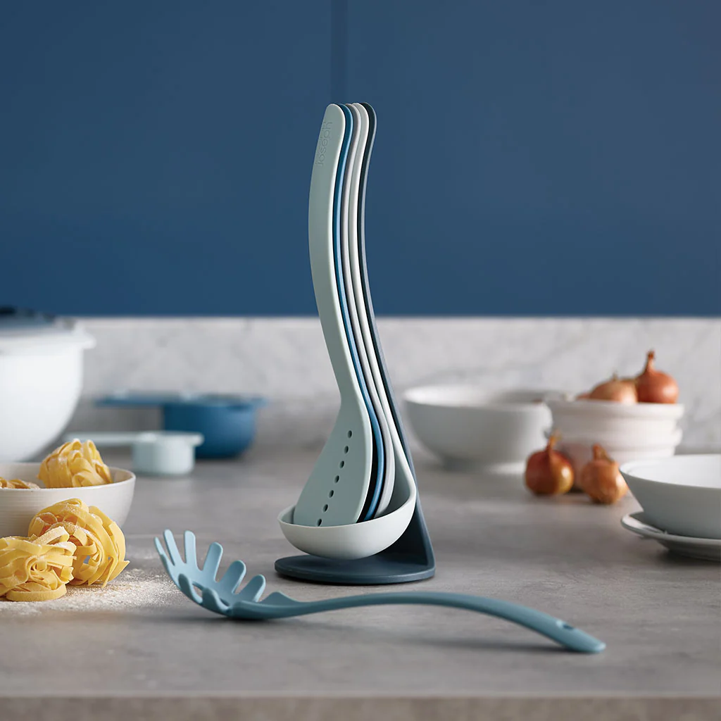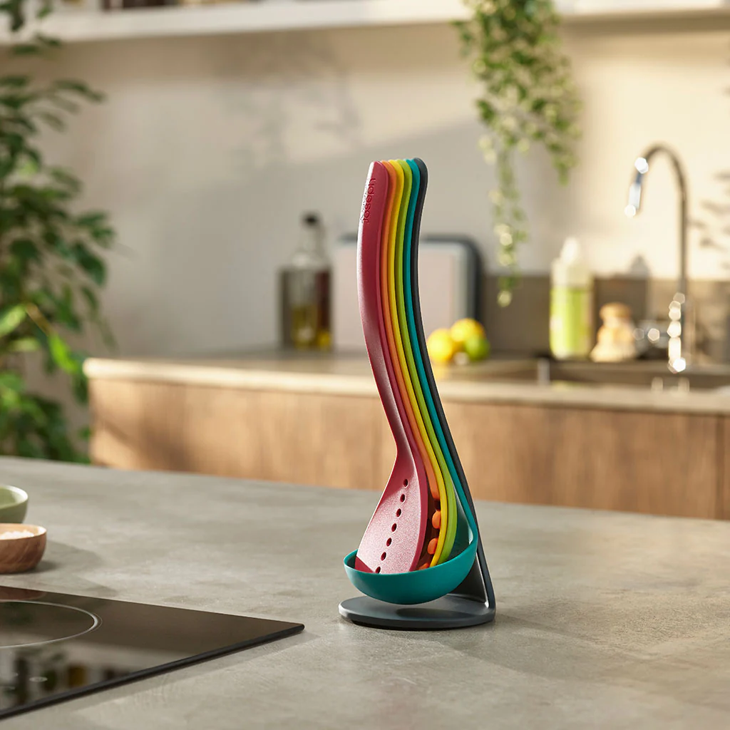 ¡Seguro que lo has visto antes! El popular Juego de 5 utensilios de cocina apilables con soporte Nest Utensils Plus Joseph Joseph es un set que incluye cinco utensilios indispensables para cocinar y un soporte para tenerlos siempre organizados y a mano, listos para su uso. Los utensilios tienen un imán integrado en el mango, lo que permite encajarlos entre sí y colocarlos juntos y ordenados en el soporte magnético, ocupando el mínimo espacio sobre la encimera.