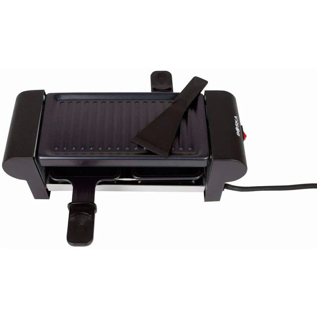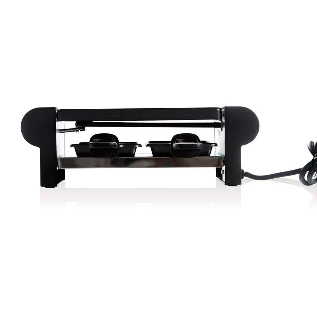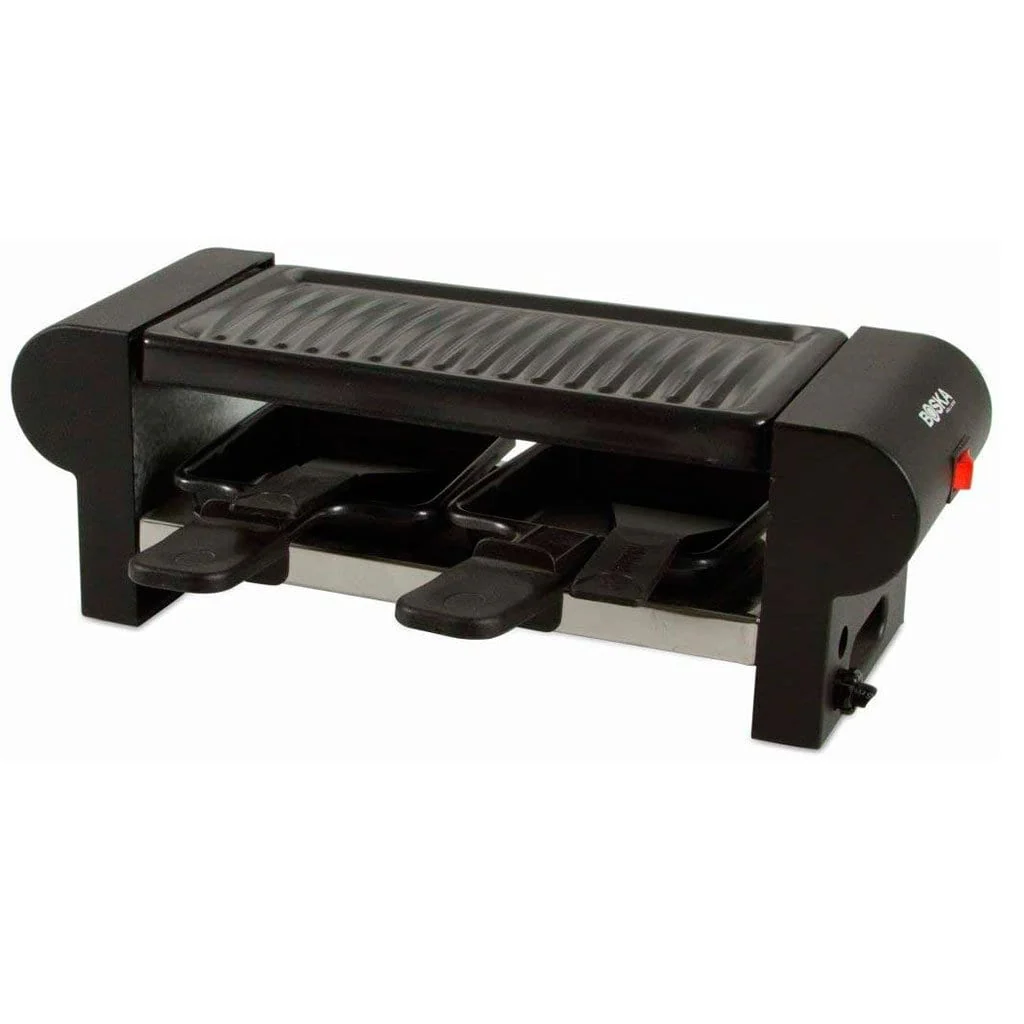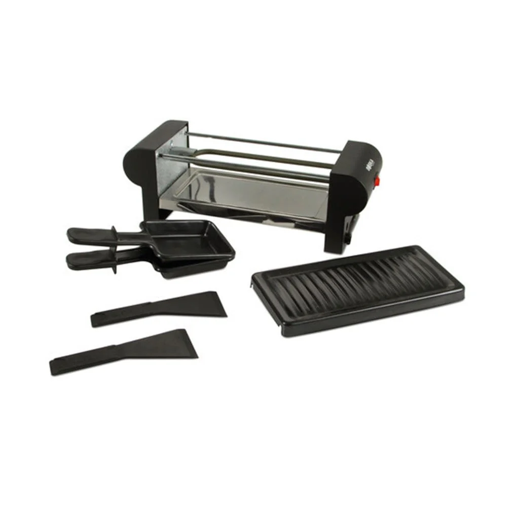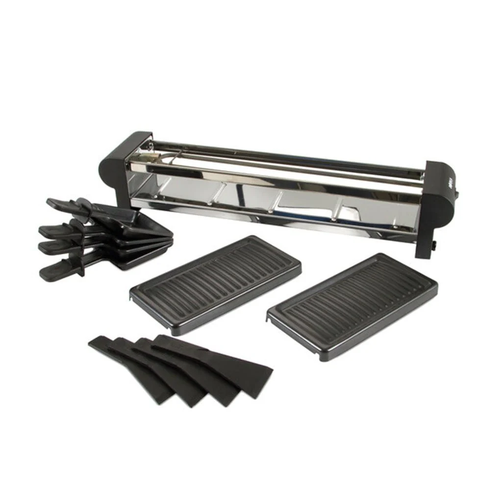 - Raclette pequeña: 30,5 cm x 11 cm x 11 cm, con 220V de potencia, ideal para 2 personas.