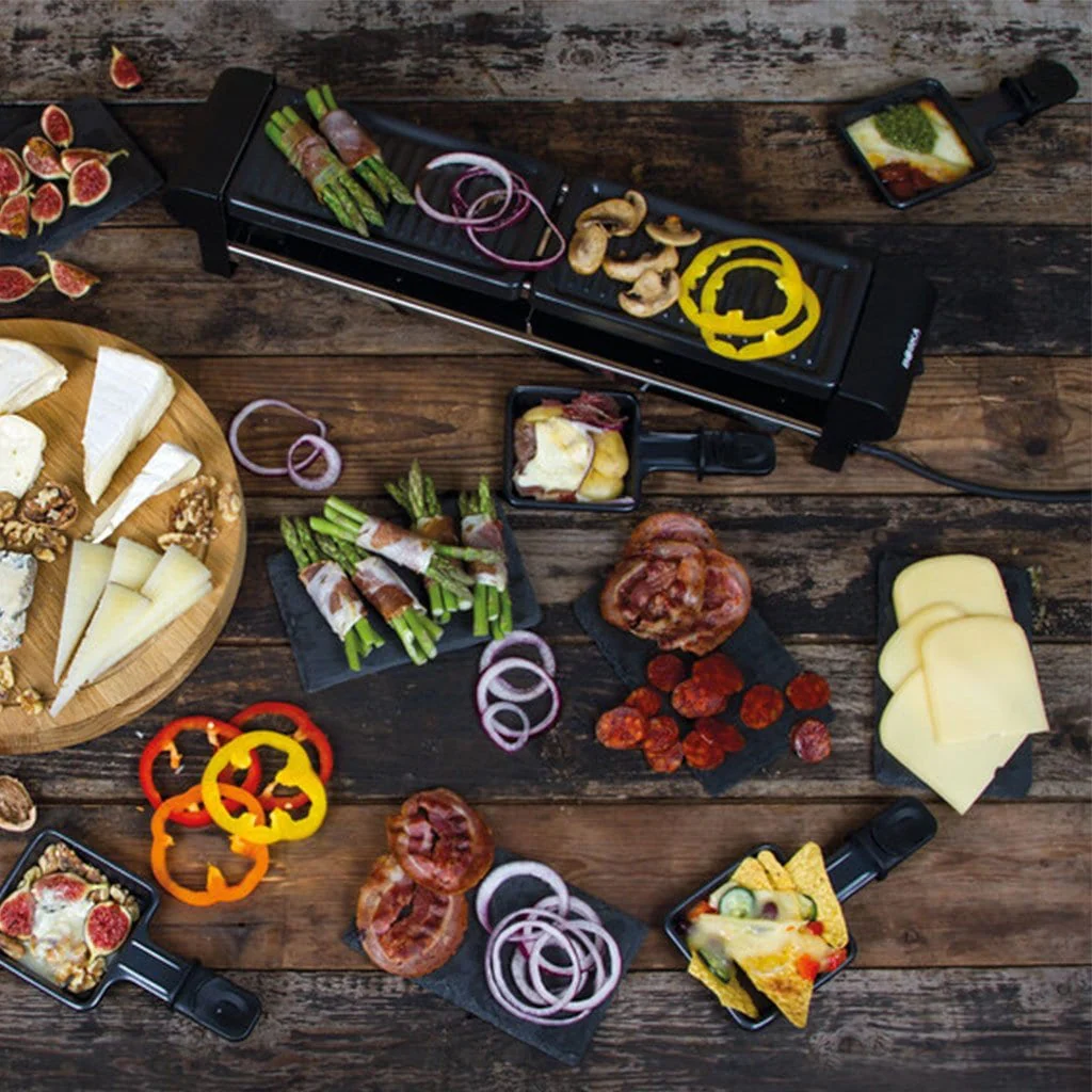 - A parte de servirte para cocinar el queso y preparar la Raclette, este juego también incorpora una parrilla superior, donde vas a poder cocinar vegetales, tostar el pan, o cocinar pequeños trozos de carne.
