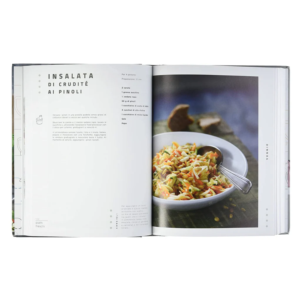 Las recetas del libro de cocina están agrupadas por capítulos: conceptos básicos, preparación de alimentos frescos, carne y salados, pastas y granos, y dulces. Encontrarás recetas rápidas y sencillas de elaborar, perfectas tanto para el día a día como para las celebraciones, que podrás preparar de forma fácil y cómoda con tu robot de cocina.