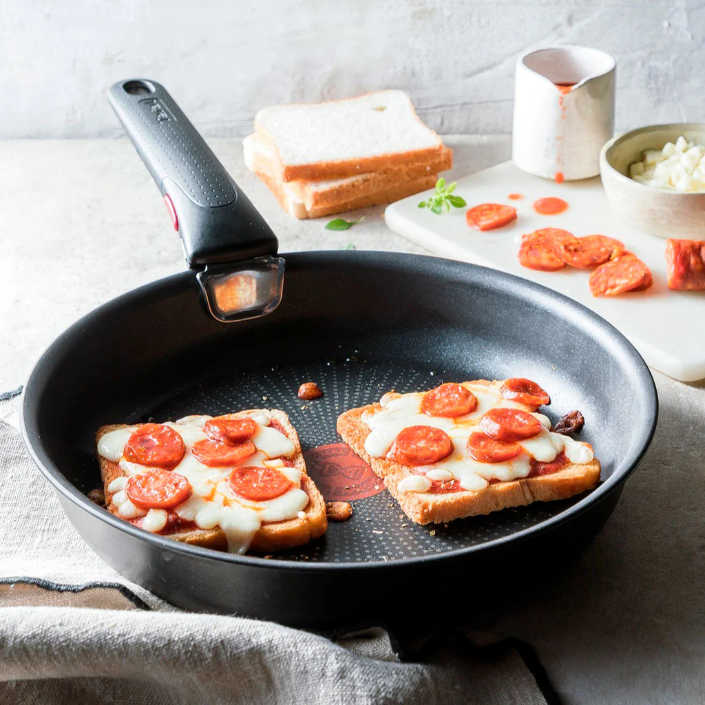 Del fuego al horno y del horno a la mesa o a la nevera. El Lote de Sartenes Ingenio Unlimited de Tefal te lo pone así de fácil. Este set de 3 piezas está formado por dos sartenes antiadherentes y un mango extraíble, que te permitirá gratinar o dorar en el horno lo que hayas cocinado en el fuego, llevarlo a la mesa para servir o guardar lo que sobre en la nevera, con solo encajar o sacar el mango.