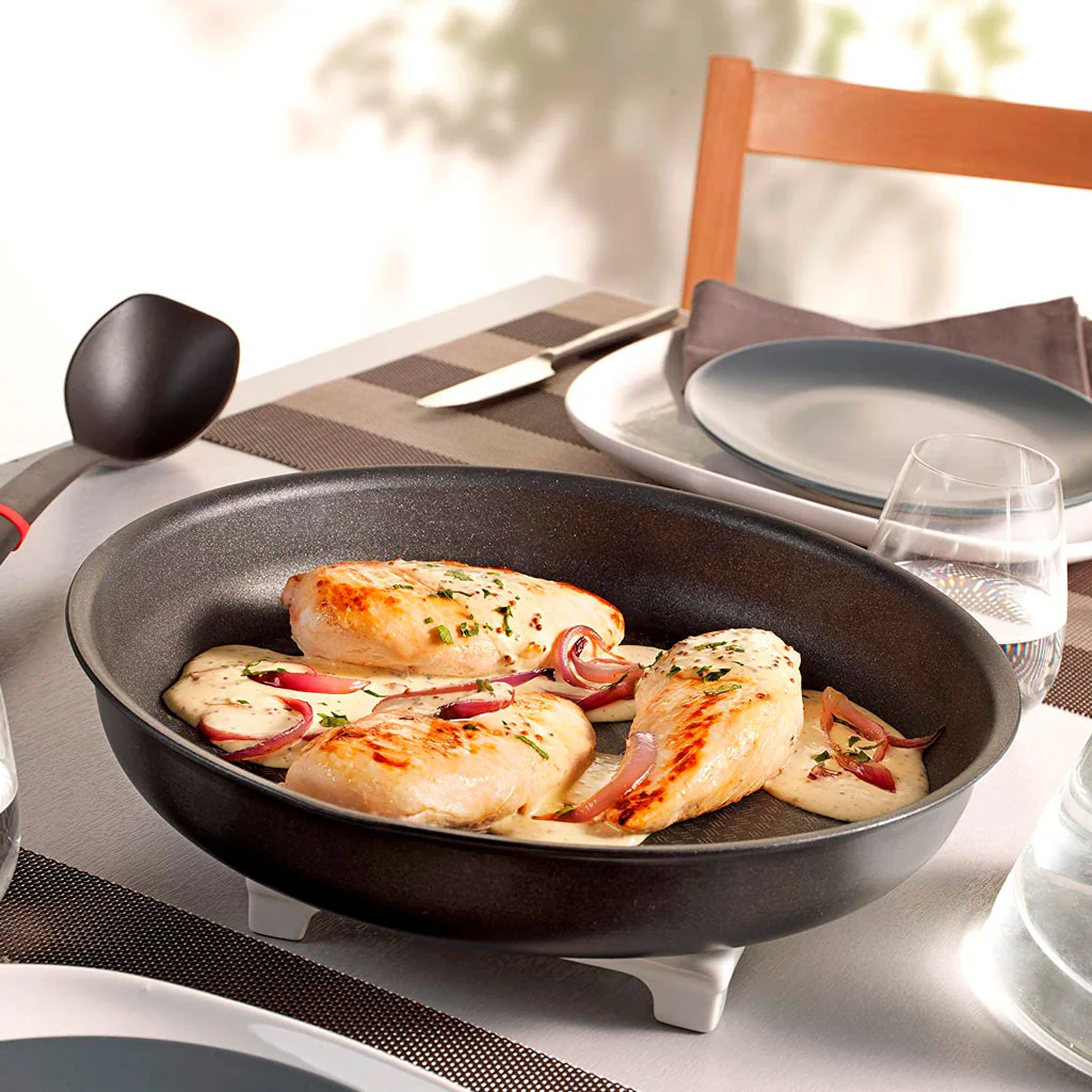 - Con solo poner o quitar el mango tendrás la sartén en los fogones, de los fogones al horno, del horno a la mesa y de la mesa, si sobra algo, ¡a la nevera!
