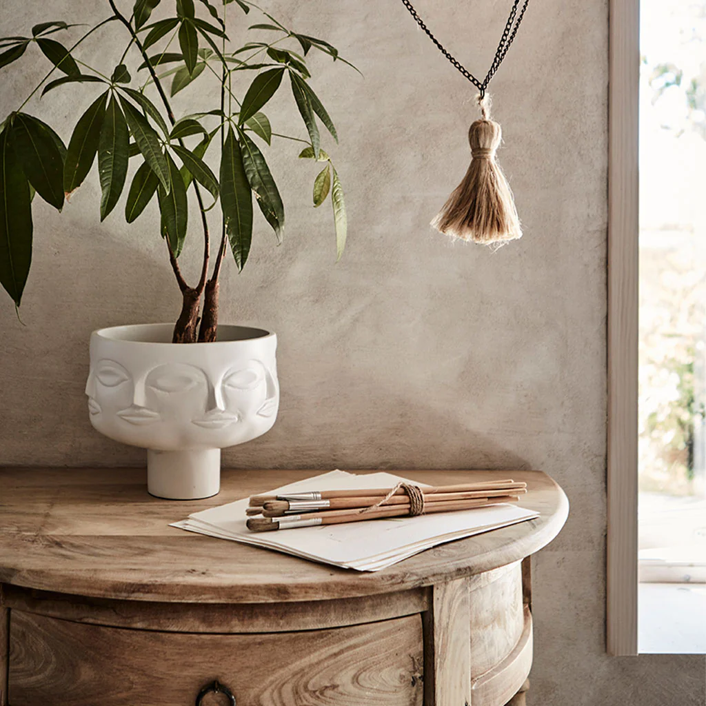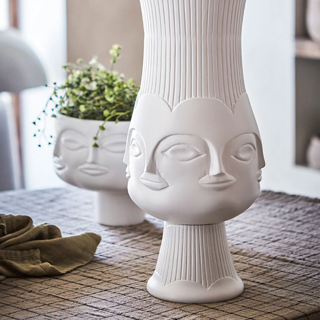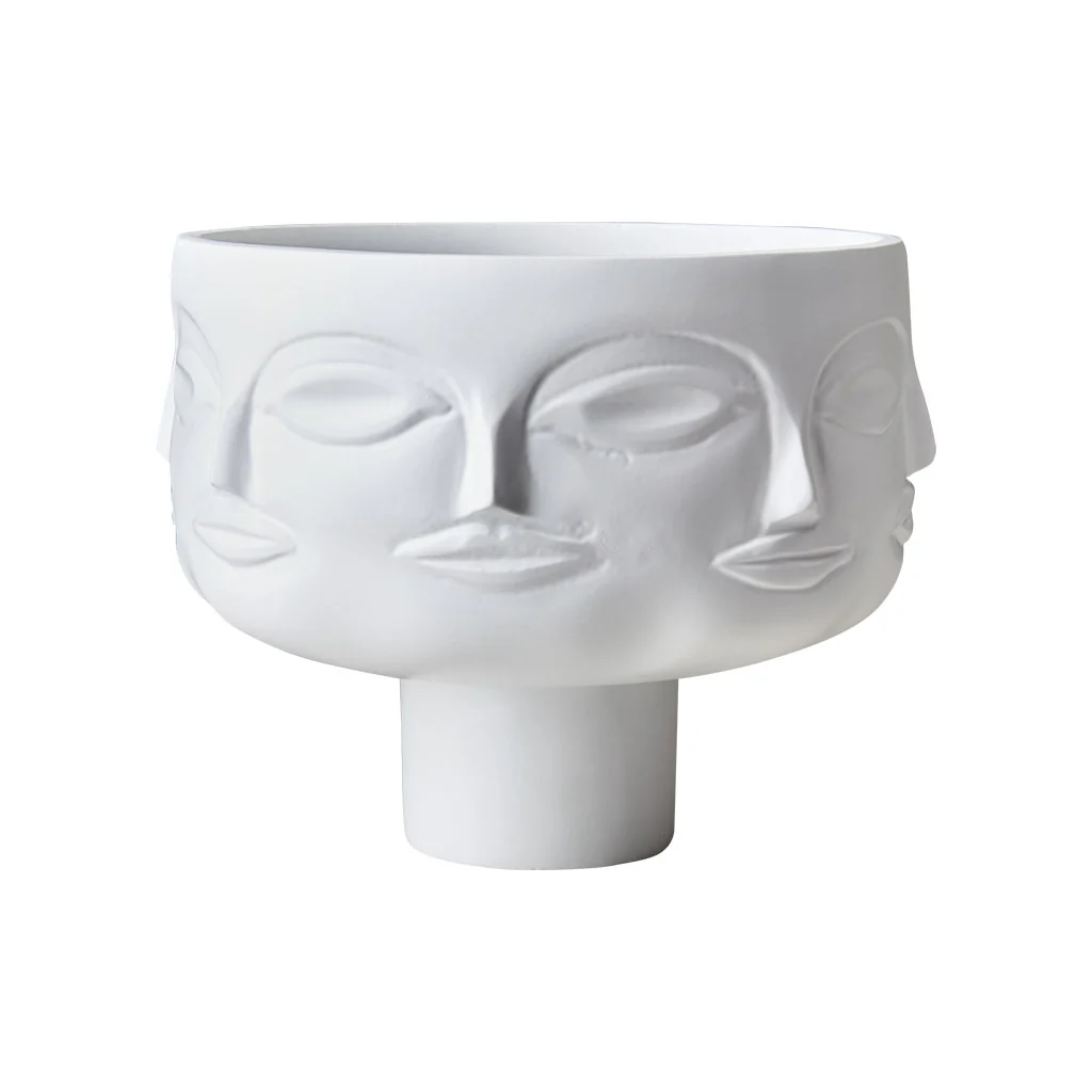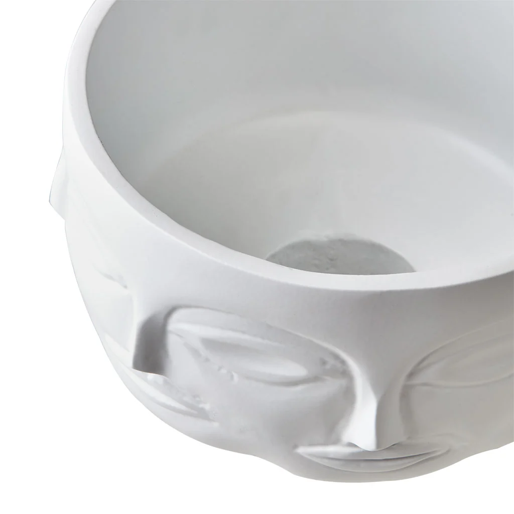 Se trata de una maceta con caras grabadas en relieve, ¡una pieza que definitivamente atraerá miradas en tu hogar! Con su elegante color blanco y recubrimiento de polvo, esta maceta es la mezcla perfecta entre arte y funcionalidad.