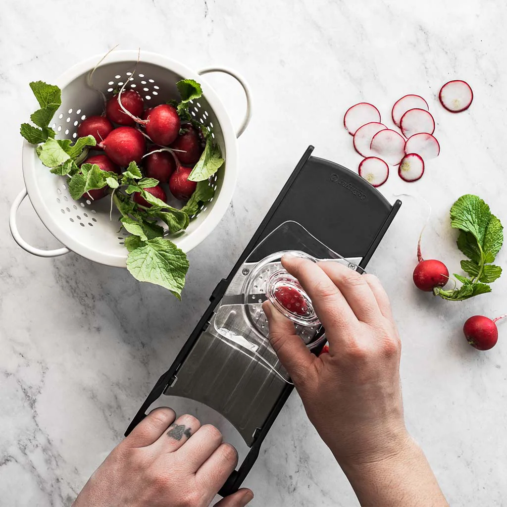 - Mandolina japonesa ultra compacta con cuchilla de acero inoxidable integrada.
