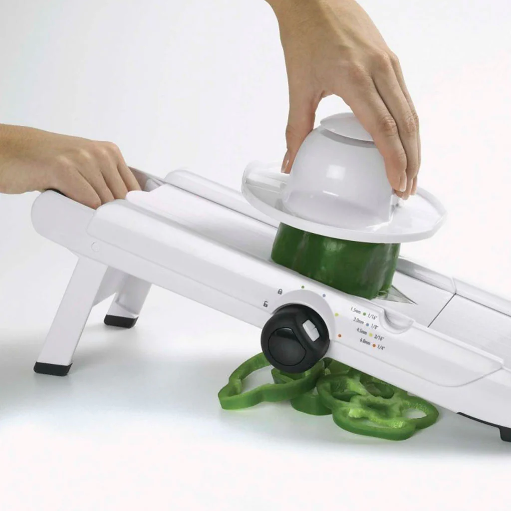 - Mandolina de cocina compacta con cuchilla en V y protector empujador.