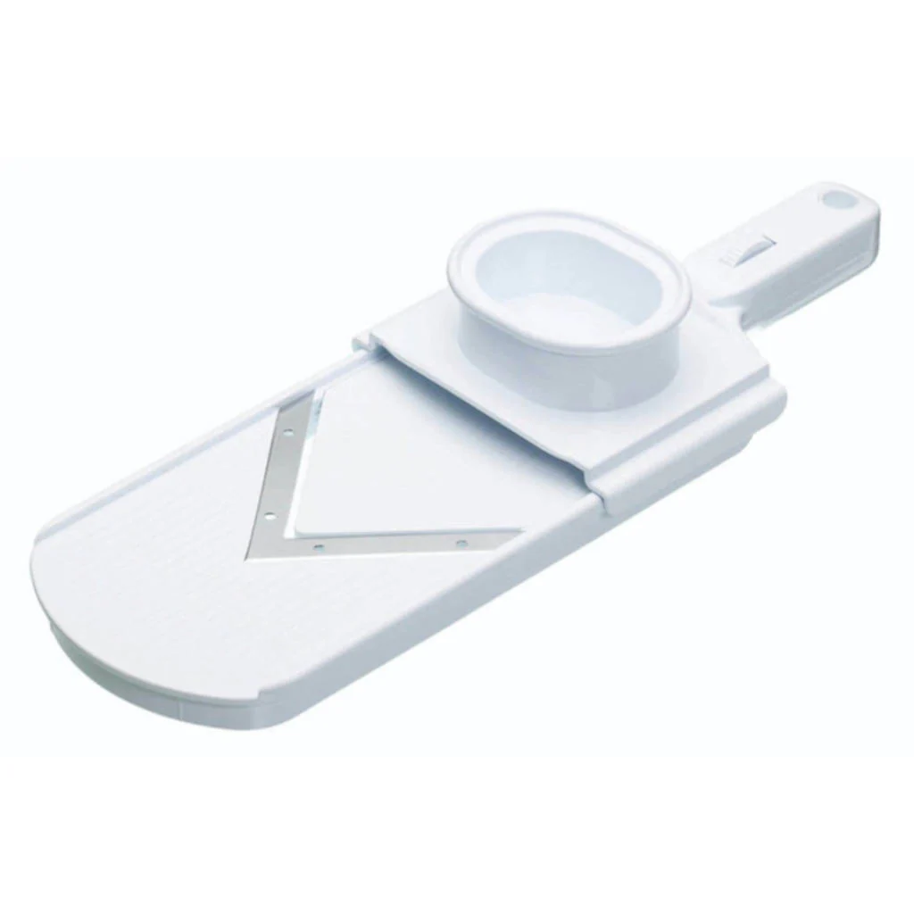 La cuchilla en V ayuda a realizar cortes sin aplastamiento de las verduras y frutas más blandas: en las mandolinas con hojas rectas, la fruta choca directamente y de pronto contra la cuchilla, aplastando o golpeando fuertemente el alimento. Por el contrario, las hojas en V facilitan el deslizamiento: el alimento entra progresivamente en el corte, sin choques y sin aplastar la pieza. ¡Mucho más limpio y eficaz! Resulta mejor para todo tipo de alimentos, pero especialmente lo apreciarás en alimentos como el tomate y frutas blandas como las ciruelas o melocotones.