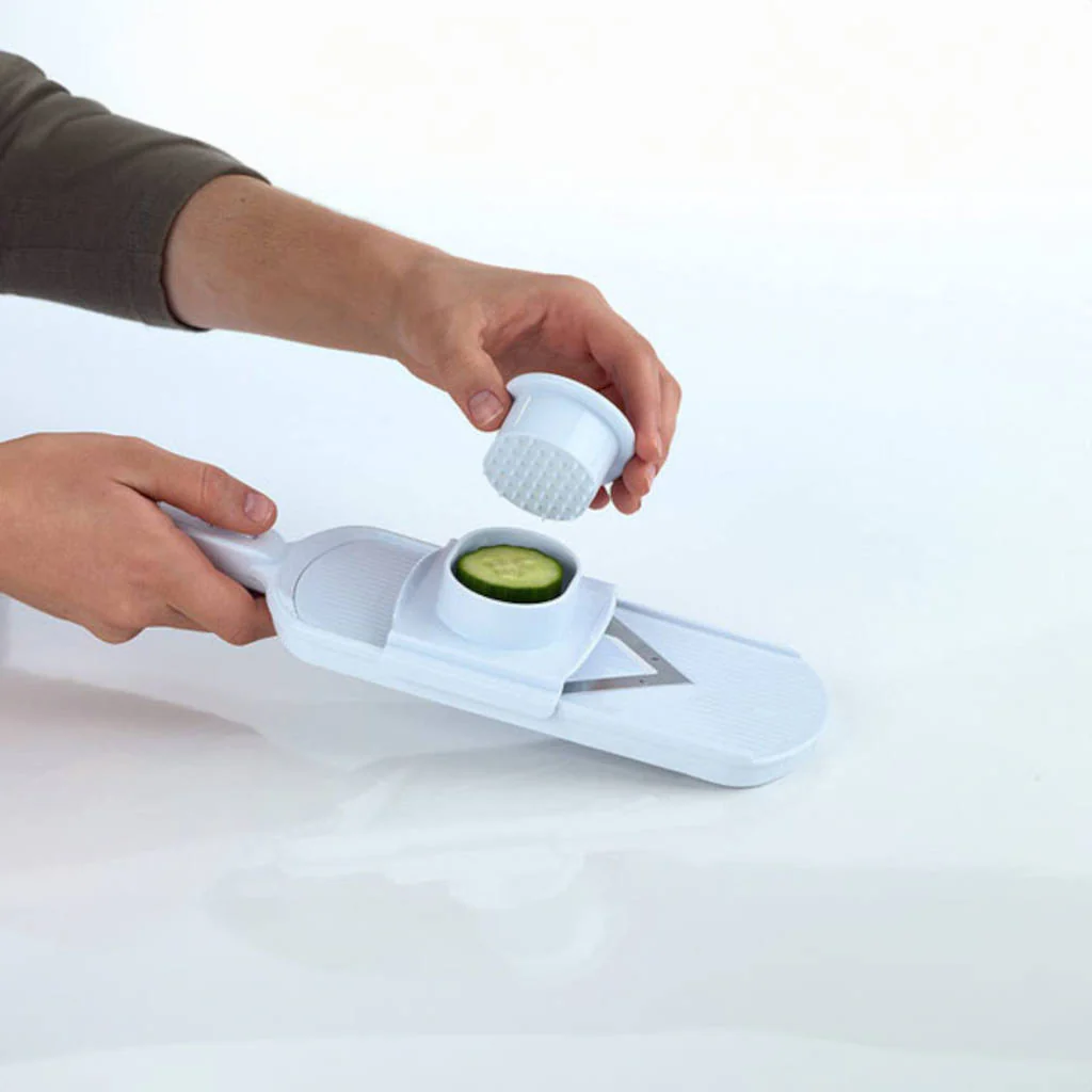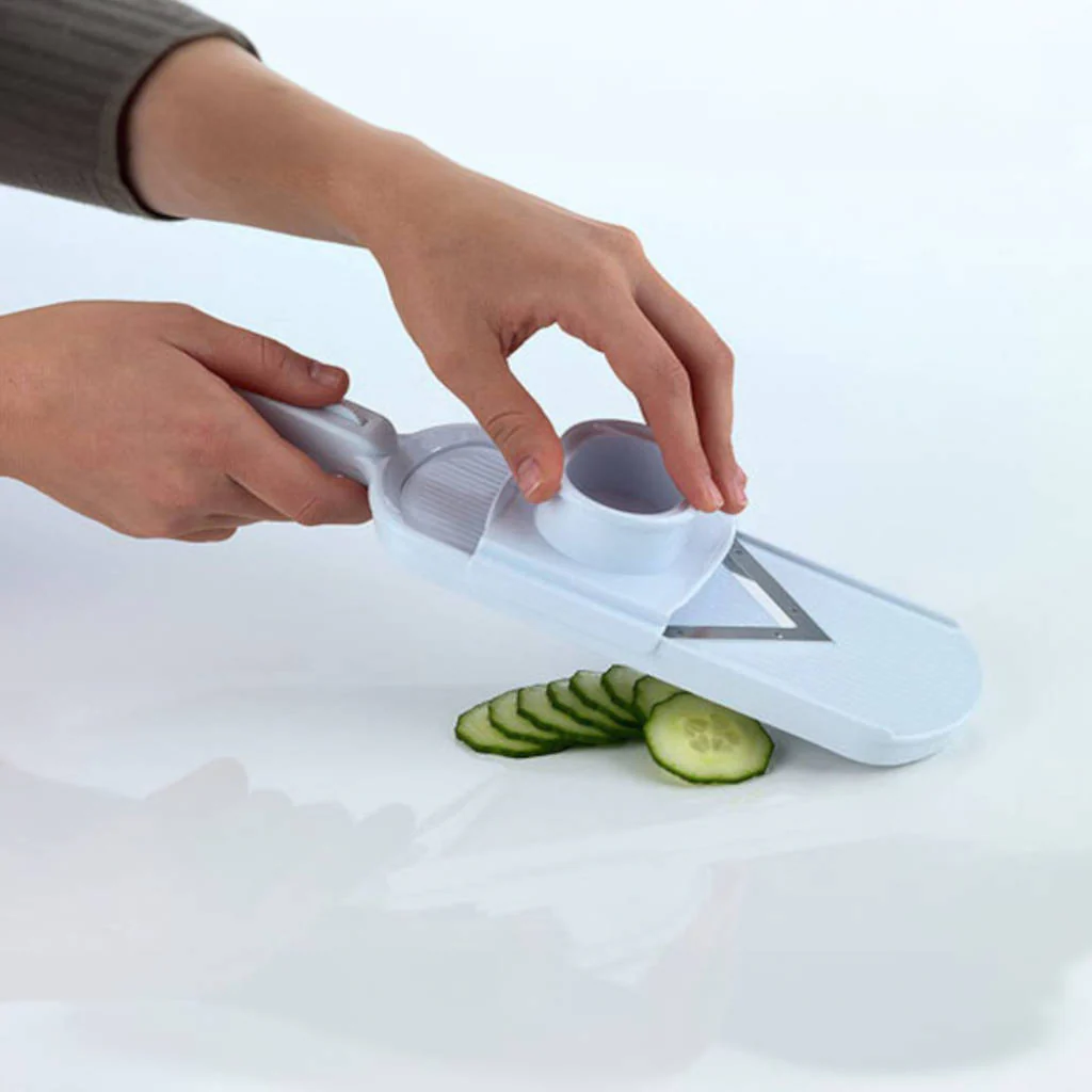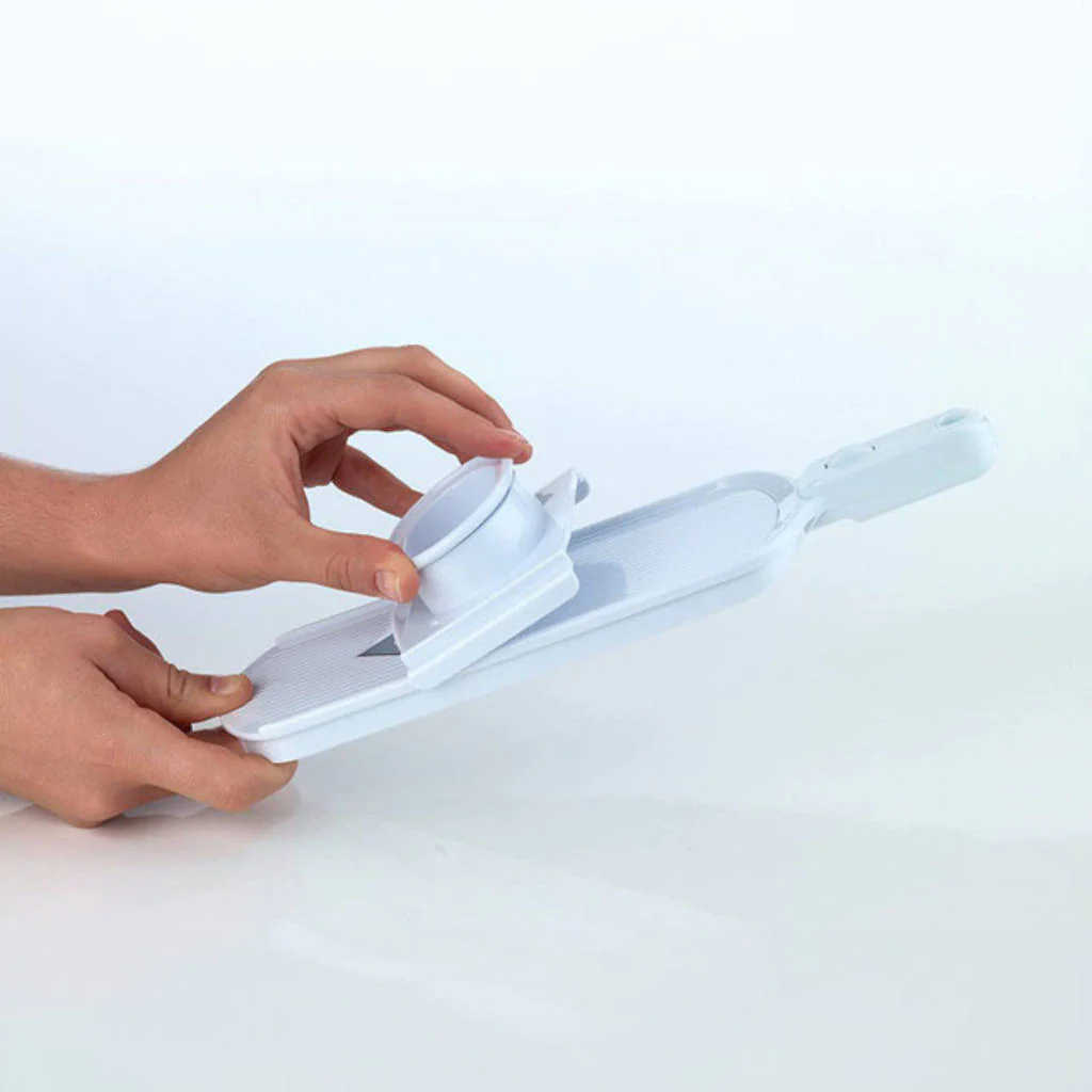 Para usarla, simplemente agarra el asa, coloca tu fruta o verdura en el sujetador de seguridad y desliza hacia adelante y hacia atrás para cortar. Está hecha de plástico resistente y ligero, por lo que es perfecta para el uso diario y fácil de manejar. Menos complicaciones que un cuchillo, menos problemas que un voluminoso procesador de alimentos, y rebanadas perfectas cada vez. ¡Así de simple!