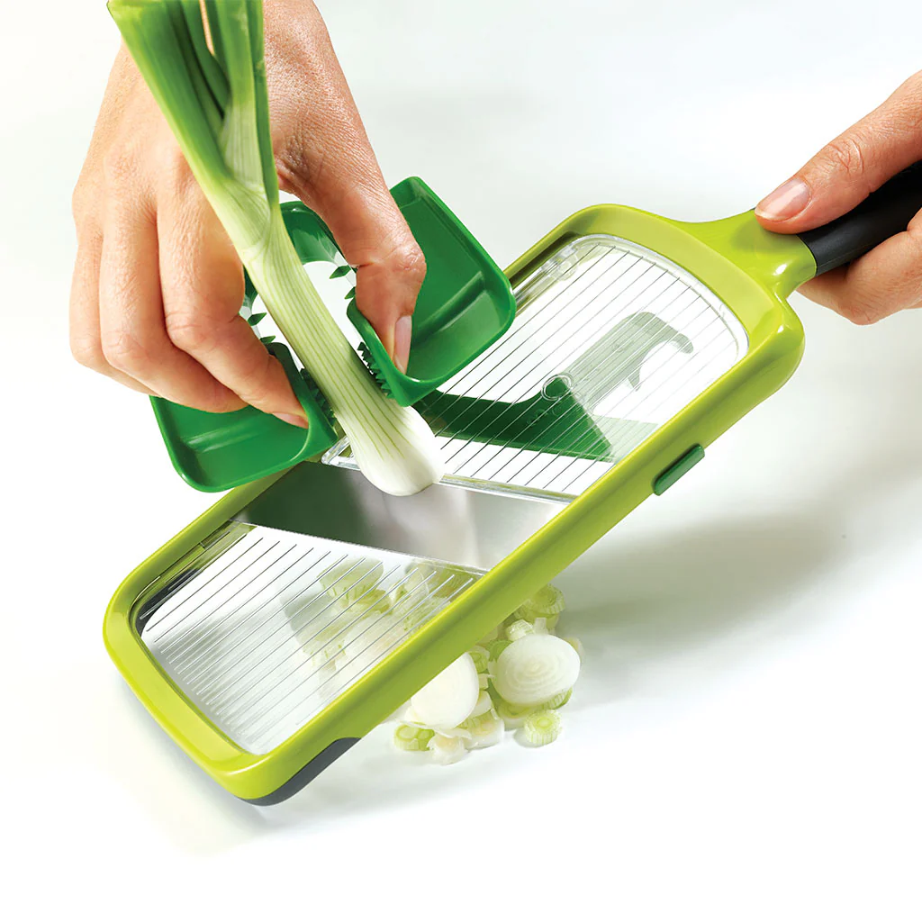 Con la Mandolina Multi-Grip Joseph Joseph podrás cortar la fruta y la verdura para tus recetas de forma sencilla, rápida y segura. Esta práctica mandolina de cocina dispone de una afilada cuchilla de acero inoxidable dispuesta en diagonal, que proporciona un corte preciso y eficaz. Destaca por su accesorio protector que, además de protegerte los dedos, te permite sujetar fácilmente los alimentos, sea cual sea su tamaño.
