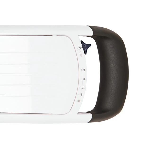 - Permite seleccionar tres grosores de corte distintos (1,5 mm, 3 mm, 6 mm) y el corte en juliana con un sencillo mando deslizante.
