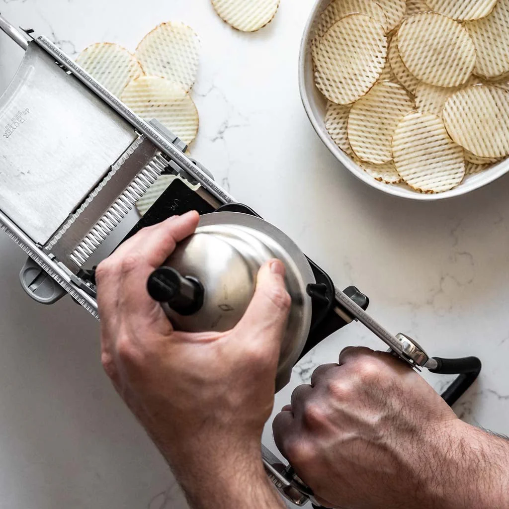 Con la Mandolina Revolution Master De Buyer no habrá corte que no puedas hacer, ¡incluso los más largos! La cuchilla microdentada de doble hoja de esta mandolina de cocina profesional penetra en los alimentos por diferentes puntos, reduciendo el impacto y el esfuerzo necesario para cortar tanto los alimentos duros como los blandos.