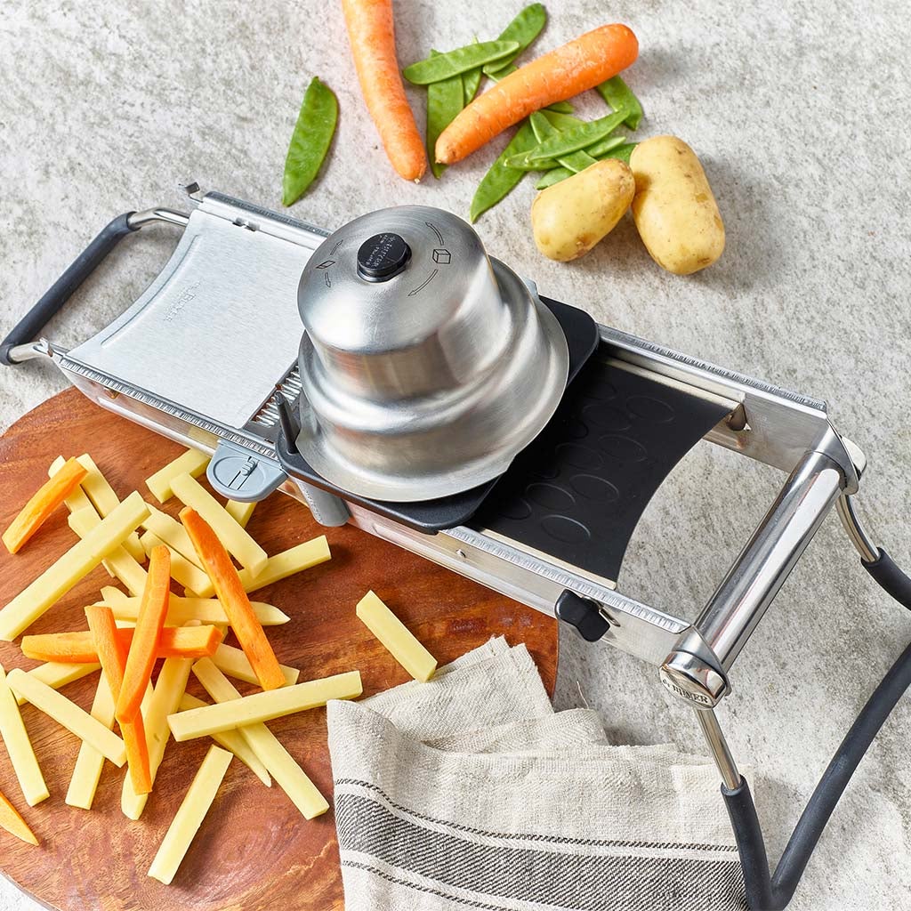 NOTA: La Mandolina Revolution Master de De Buyer es la versión más completa de la Mandolina Revolution de De Buyer. La versión Master incorpora el accesorio para cortes extralargos y un completo juego de 6 peines para cortes en juliana de 2, 3, 4, 5, 7 y 10 mm.
