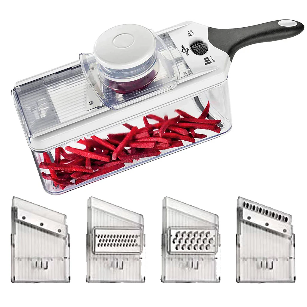 • Mandolina con 4 hojas itnercambiables, con contenedor colector