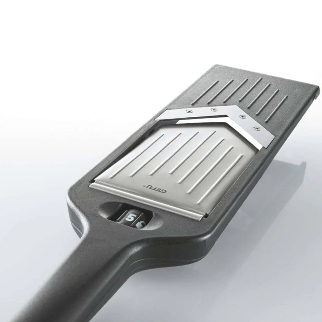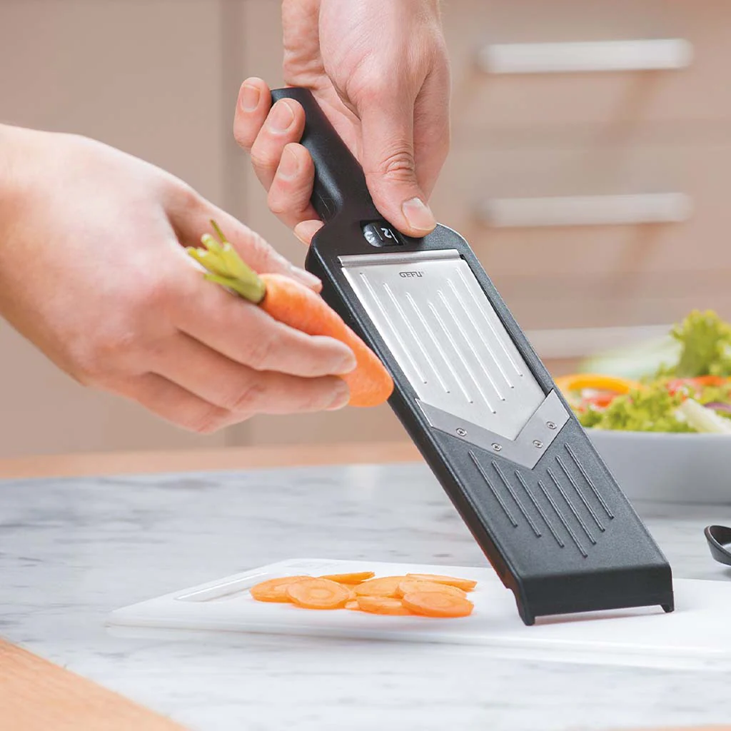 Con la Mandolina Violi de Gefu vas a poder cortar todo lo que se te ocurra. Es una mandolina de cocina práctica, compacta y muy cómoda de usar, que ocupa poco espacio en el cajón y la cocina y te soluciona tus necesidades de corte básicas del día a día.