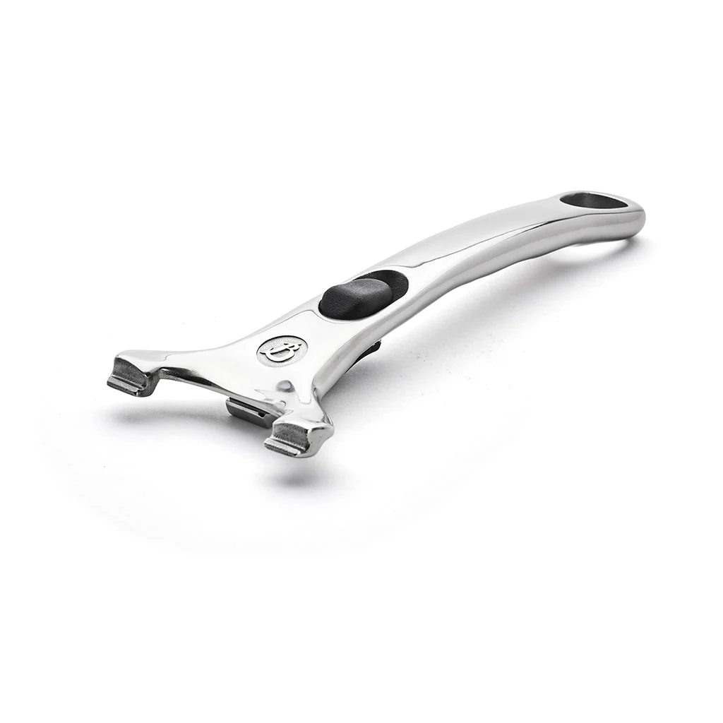- El mango Loqy es de acero inoxidable de fundición, robusto y duradero. Su diseño ergonómico con curvatura a la francesa proporciona un agarre óptimo y cómodo. El sistema de encaje es sencillo y seguro, permite fijarlo al utensilio con una sola mano, quedando acoplado con firmeza y seguridad.