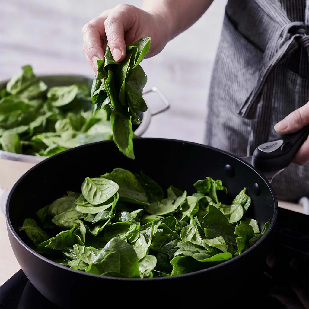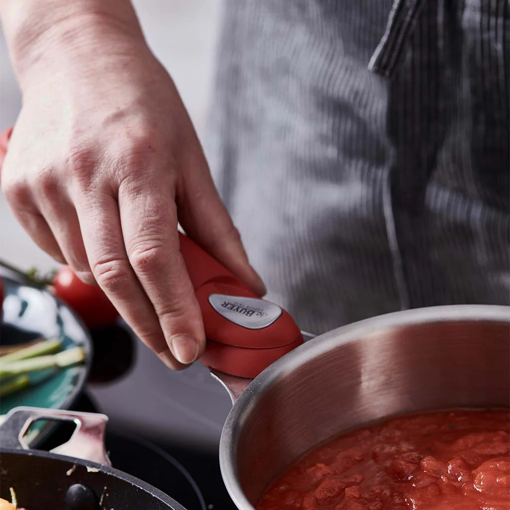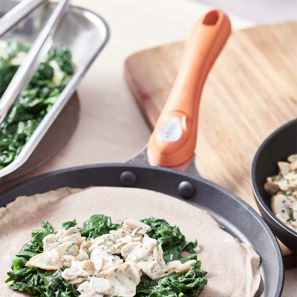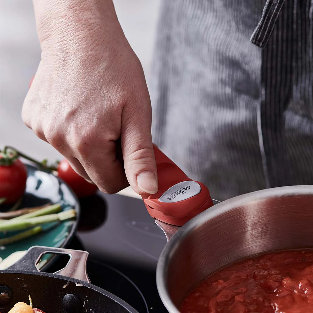 El mango se puede colocar y quitar con una sola mano (empujando el cabezal con el pulgar) y queda firmemente sujeto a la sartén. Disponible en varios colores.